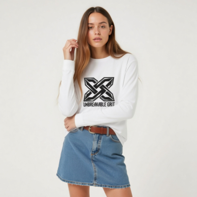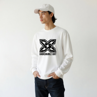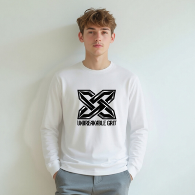 Show your strength with the bold ‘Unbreakable Grit’ X logo—designed for resilience and style. This unisex long sleeve tee features a premium cotton blend for comfort and durability. The striking black-and-silver geometric emblem stands out against clean white fabric. Ideal for everyday wear or as a statement piece. Machine washable, true to size, and built for active lifestyles.