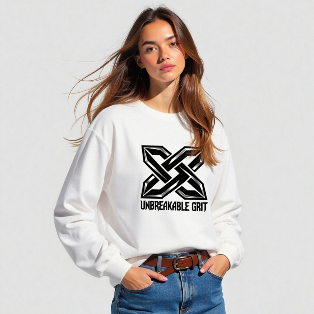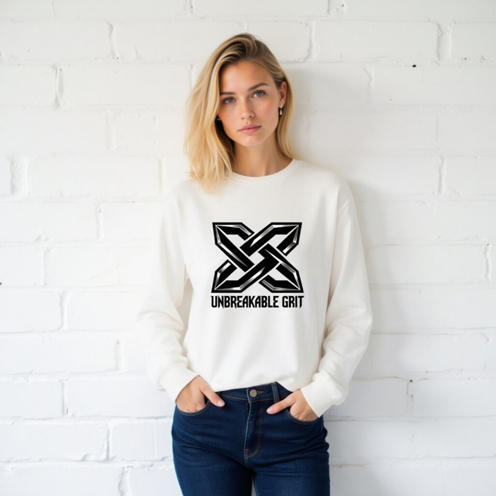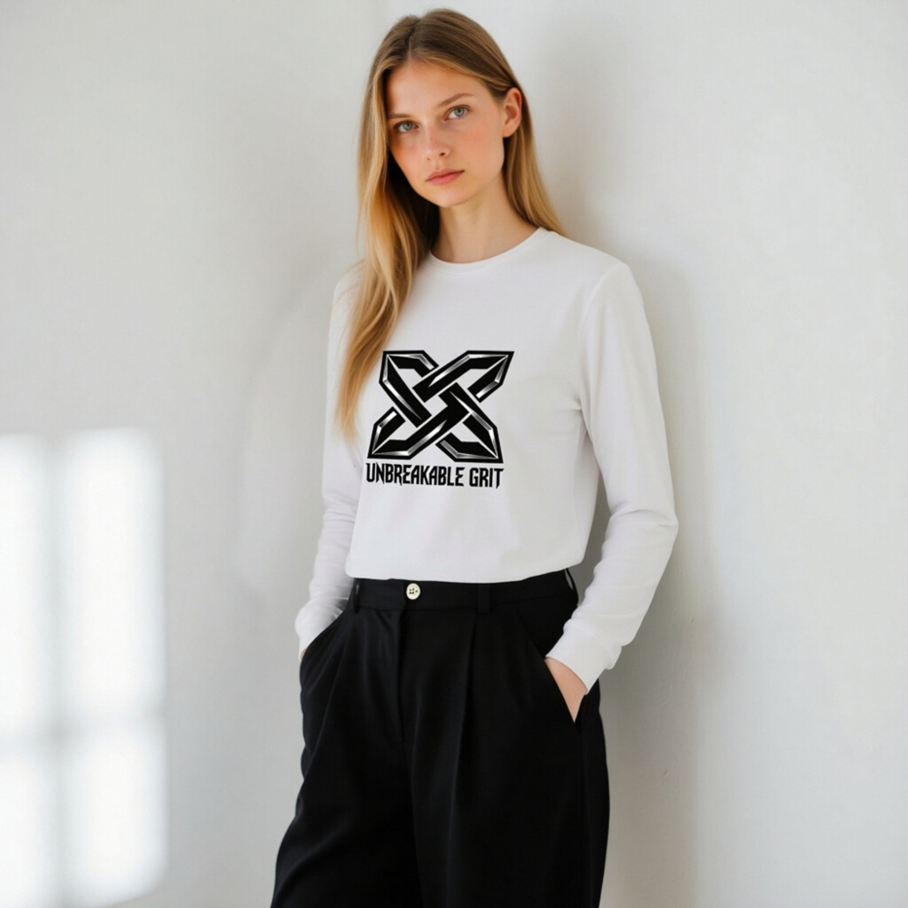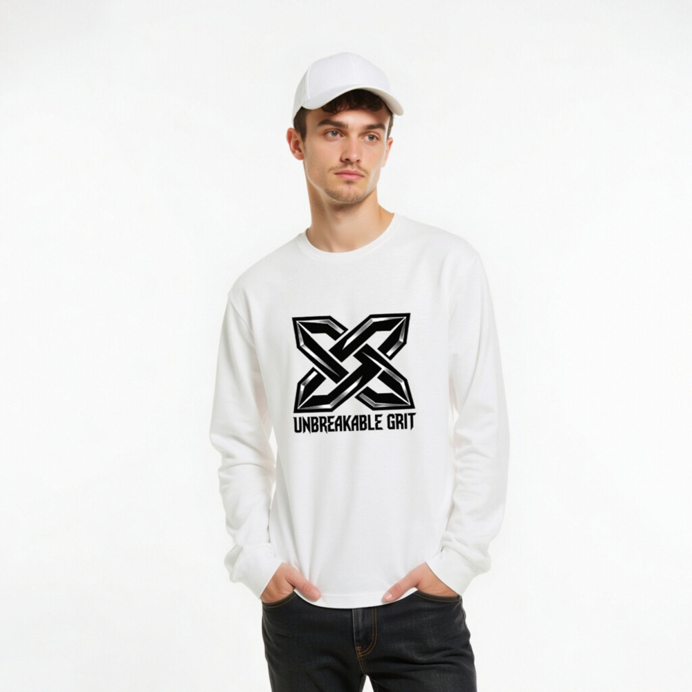 Show your strength with the bold ‘Unbreakable Grit’ X logo—designed for resilience and style. This unisex long sleeve tee features a premium cotton blend for comfort and durability. The striking black-and-silver geometric emblem stands out against clean white fabric. Ideal for everyday wear or as a statement piece. Machine washable, true to size, and built for active lifestyles.