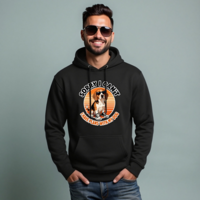This unisex premium pullover hoodie features a fun, vintage-style graphic of a beagle wearing sunglasses and sneakers, with the playful quote ‘Sorry I Can’t, I Have Plans With My Dog.’ Perfect for dog lovers seeking cozy comfort and lighthearted humor. Made from soft, durable fabric for everyday wear.
