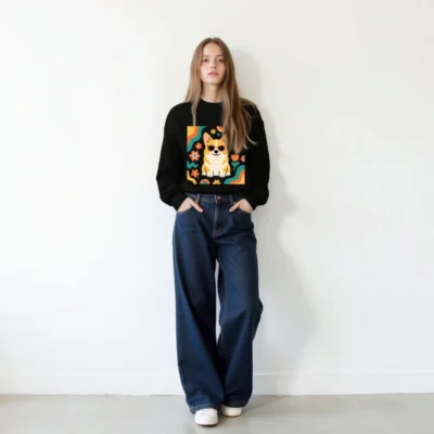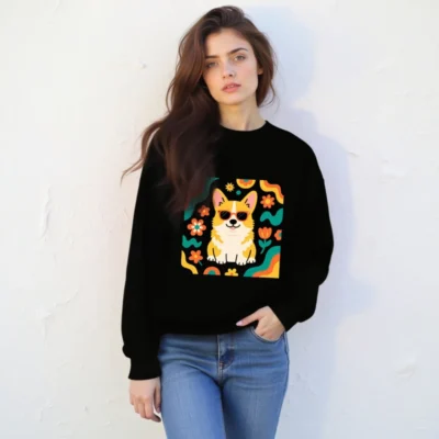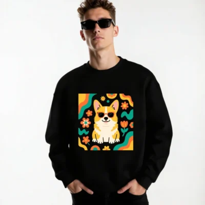 Show off your love for corgis and retro vibes with this unisex crew neck sweatshirt. Featuring a cheerful corgi in sunglasses surrounded by vibrant sunflowers, wavy greens, and warm oranges — perfect for casual wear. Soft, comfortable fit. Designed for all genders. Ideal gift for dog lovers or anyone who enjoys playful, colorful fashion.