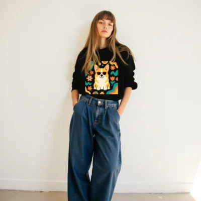Unisex Corgi Sunflower Sweatshirt – Retro Floral Dog Graphic Crew Neck
