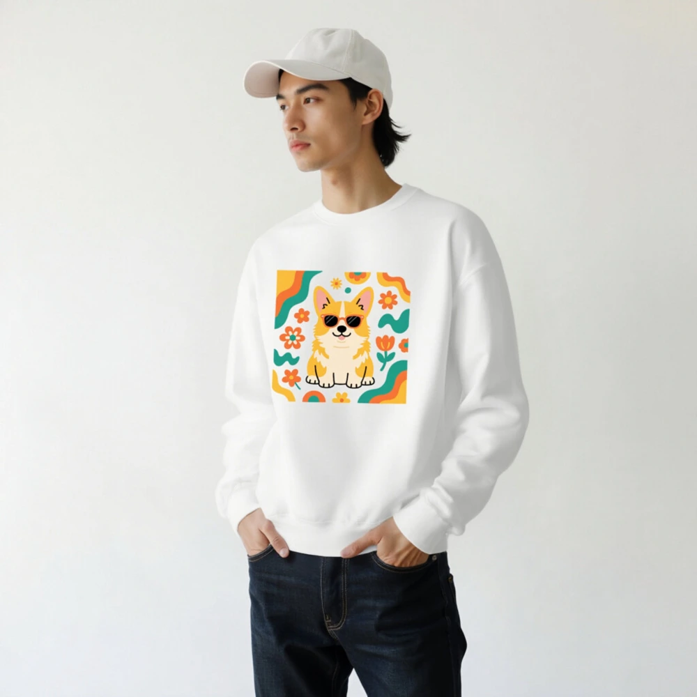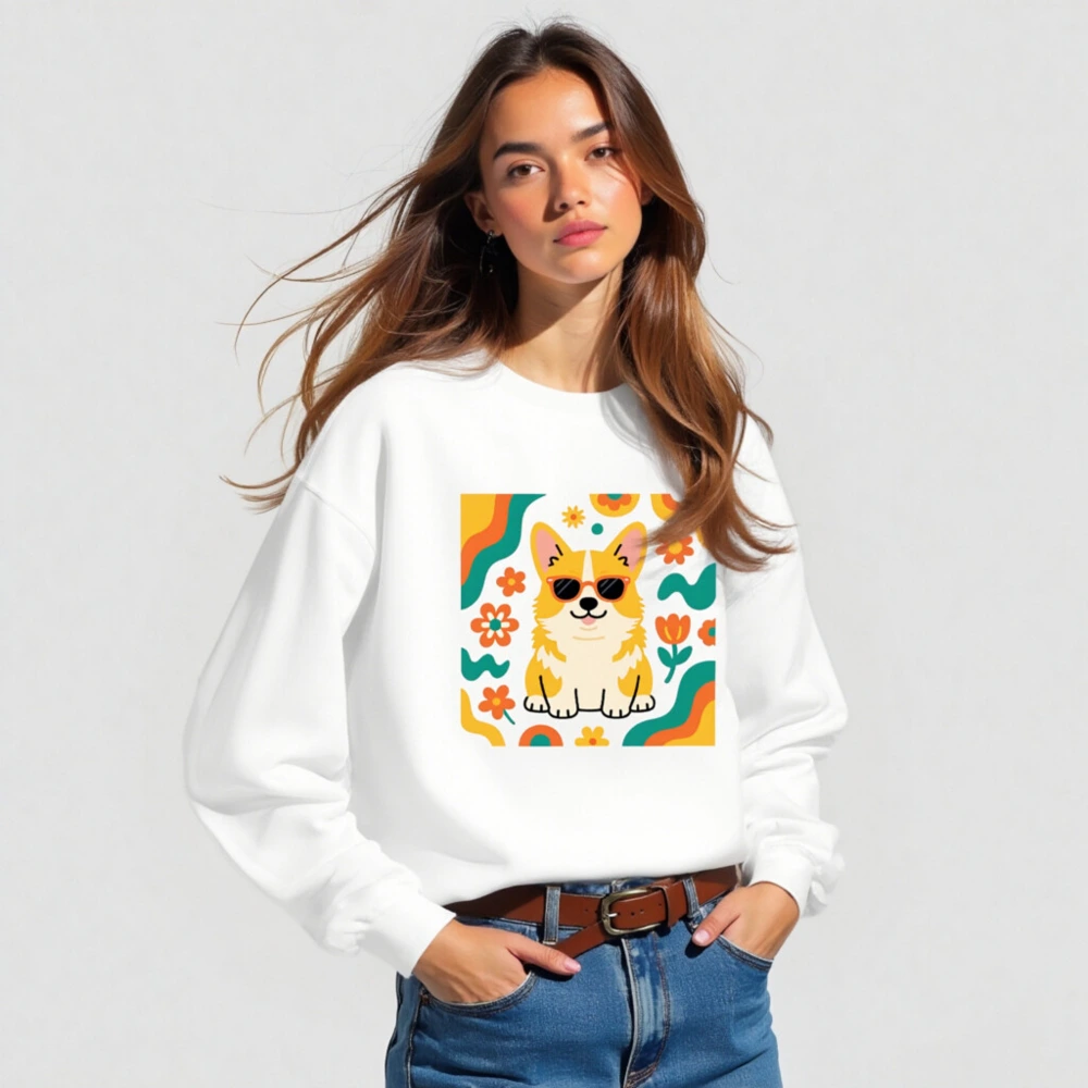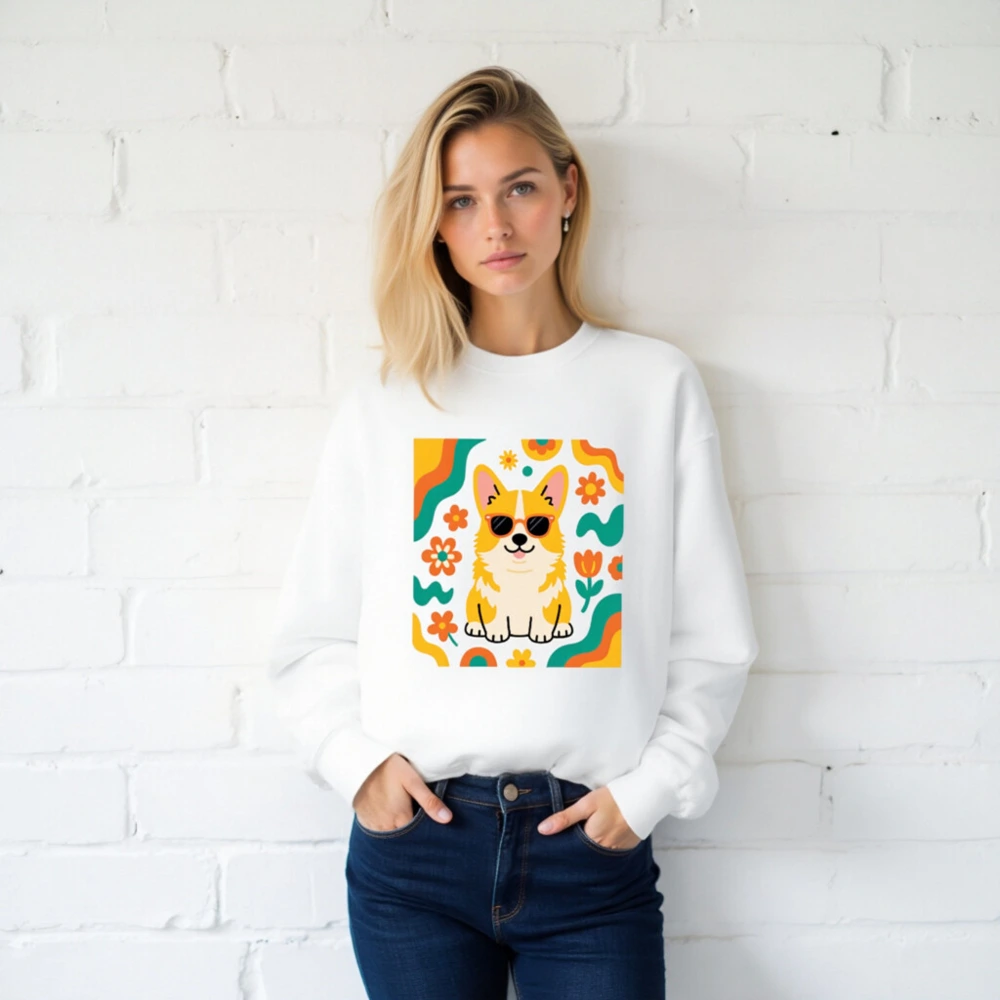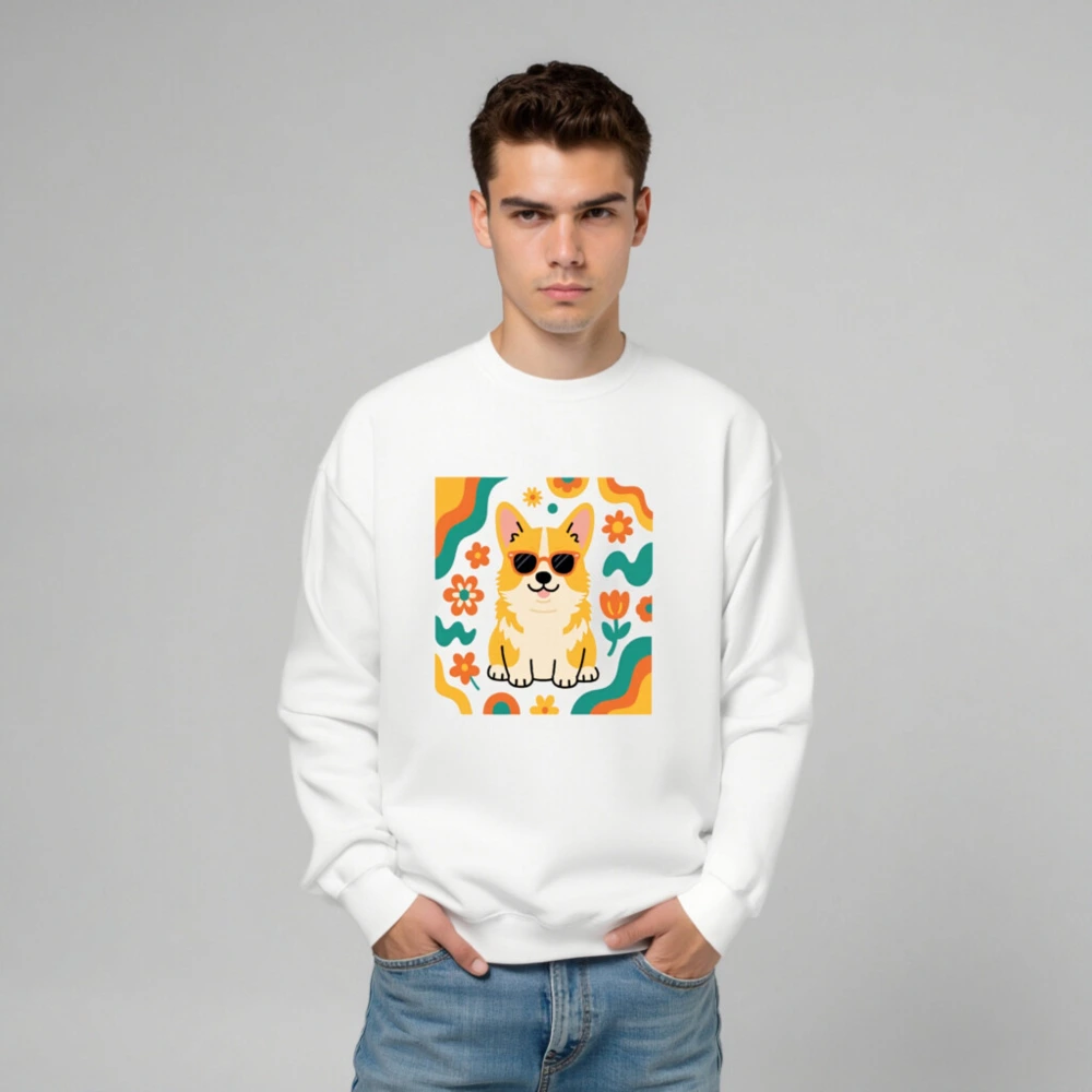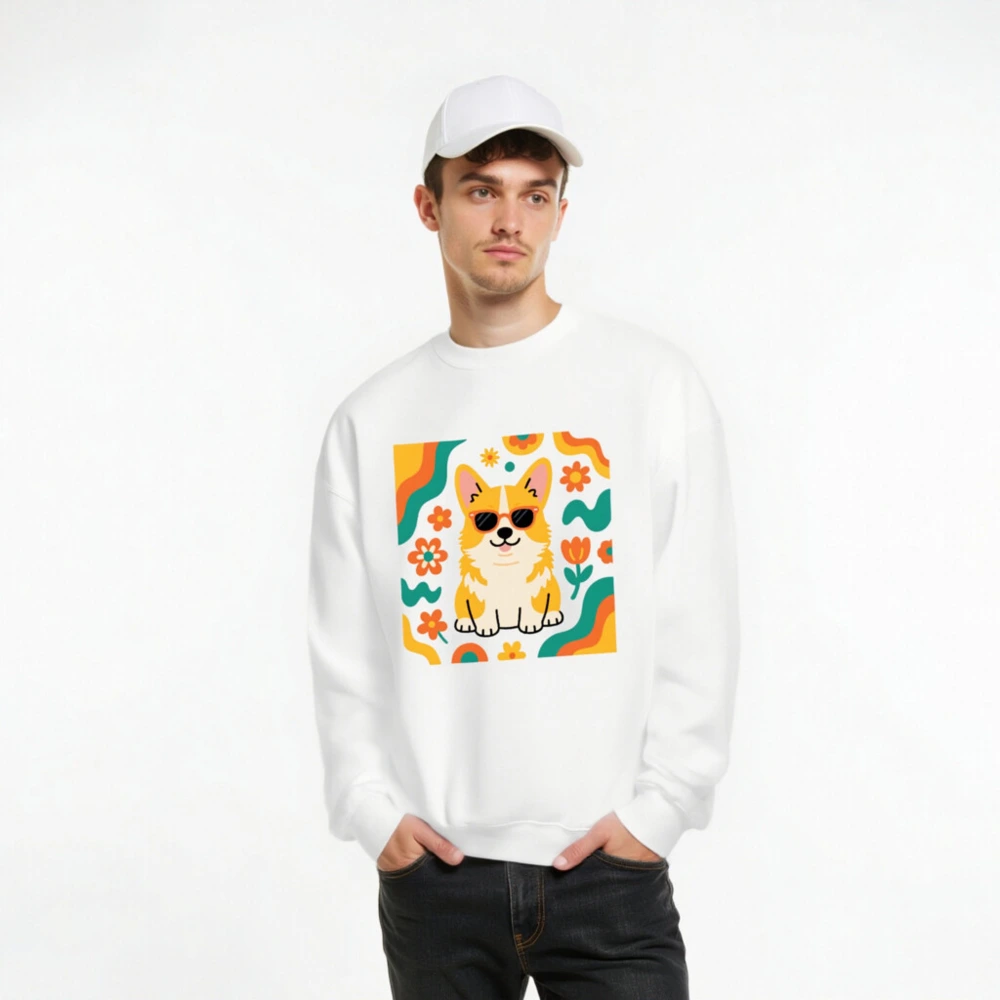 Show off your love for corgis and retro vibes with this unisex crew neck sweatshirt. Featuring a cheerful corgi in sunglasses surrounded by vibrant sunflowers and abstract waves in warm tones. Soft, comfortable, and stylish—perfect for casual wear. Designed for everyday comfort with a relaxed fit. Ideal gift for dog lovers and fans of vintage-inspired fashion.