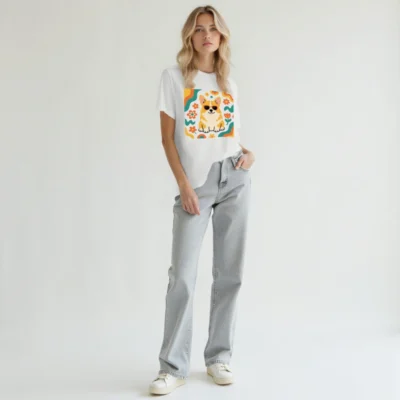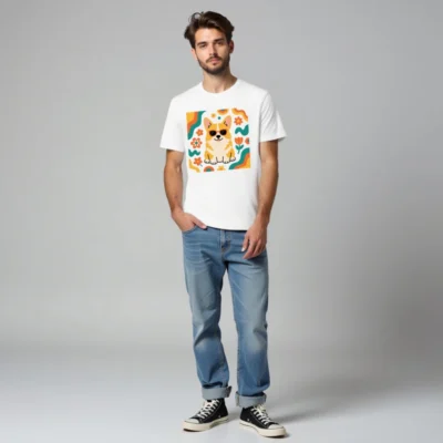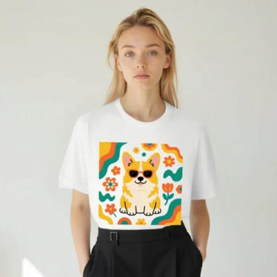 This unisex staple t-shirt features a playful corgi wearing sunglasses, surrounded by retro-style orange, teal, and yellow floral patterns. Designed for everyday comfort with a classic fit, it’s perfect for casual wear or as a fun gift. Made from soft, breathable fabric for all-day ease. Ideal for dog lovers and fans of bold, cheerful graphics.