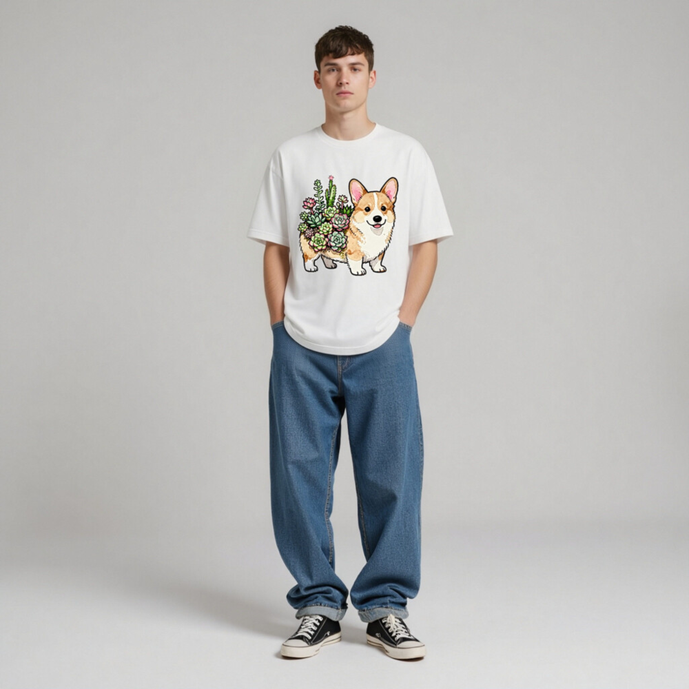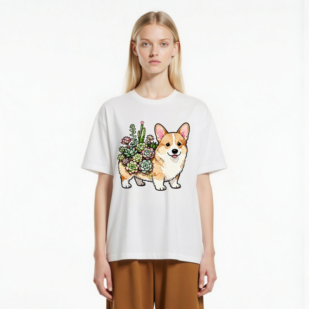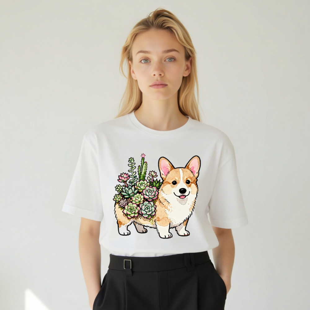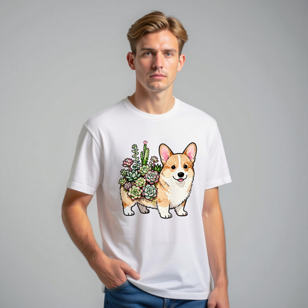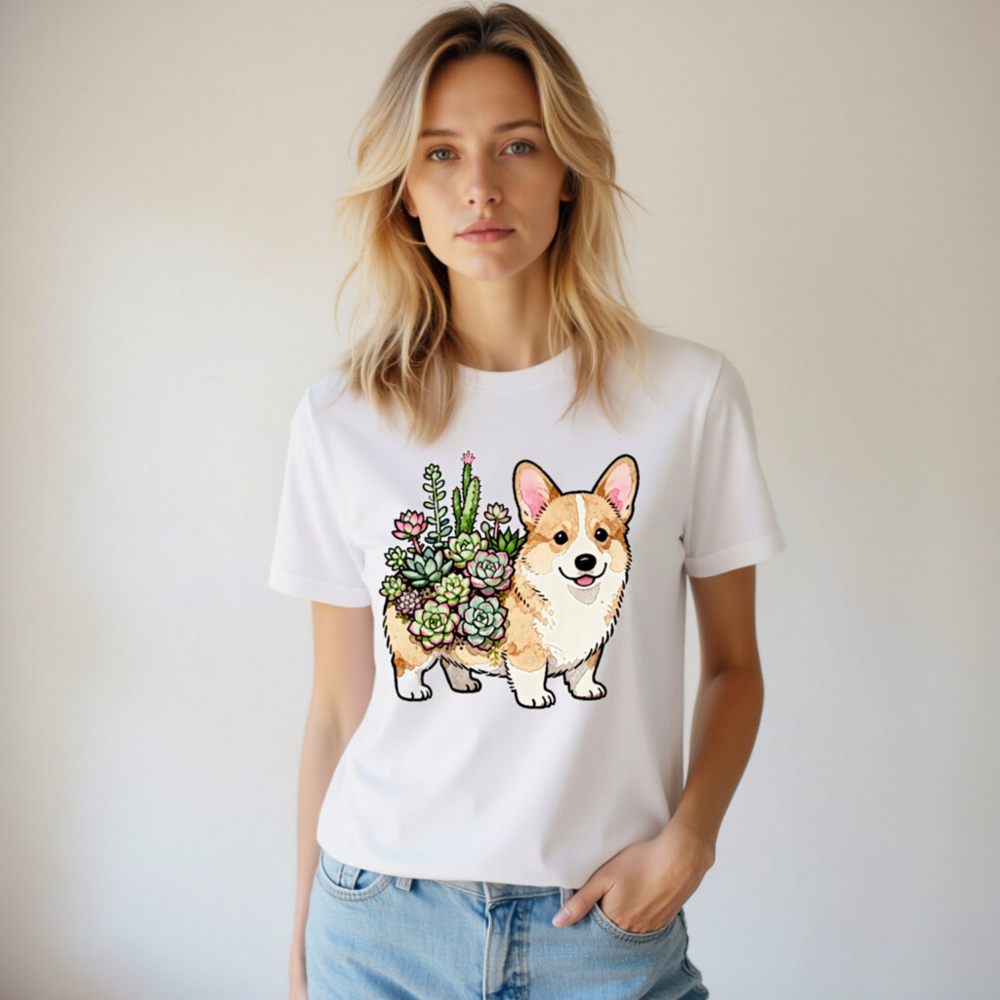 Unisex Corgi with Succulents T-Shirt | Watercolor Pet Design