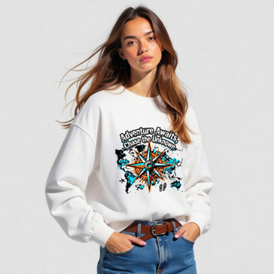 This unisex crew neck sweatshirt features a bold ‘Adventure Awaits, Chase the Unknown’ graphic with a vibrant compass over a world map splash. Designed for comfort and style, it’s perfect for travelers, explorers, and anyone seeking wanderlust-inspired fashion. Made from soft, durable fabric—ideal for daily wear or travel adventures. The eye-catching design pairs well with casual outfits and makes a statement wherever you go.