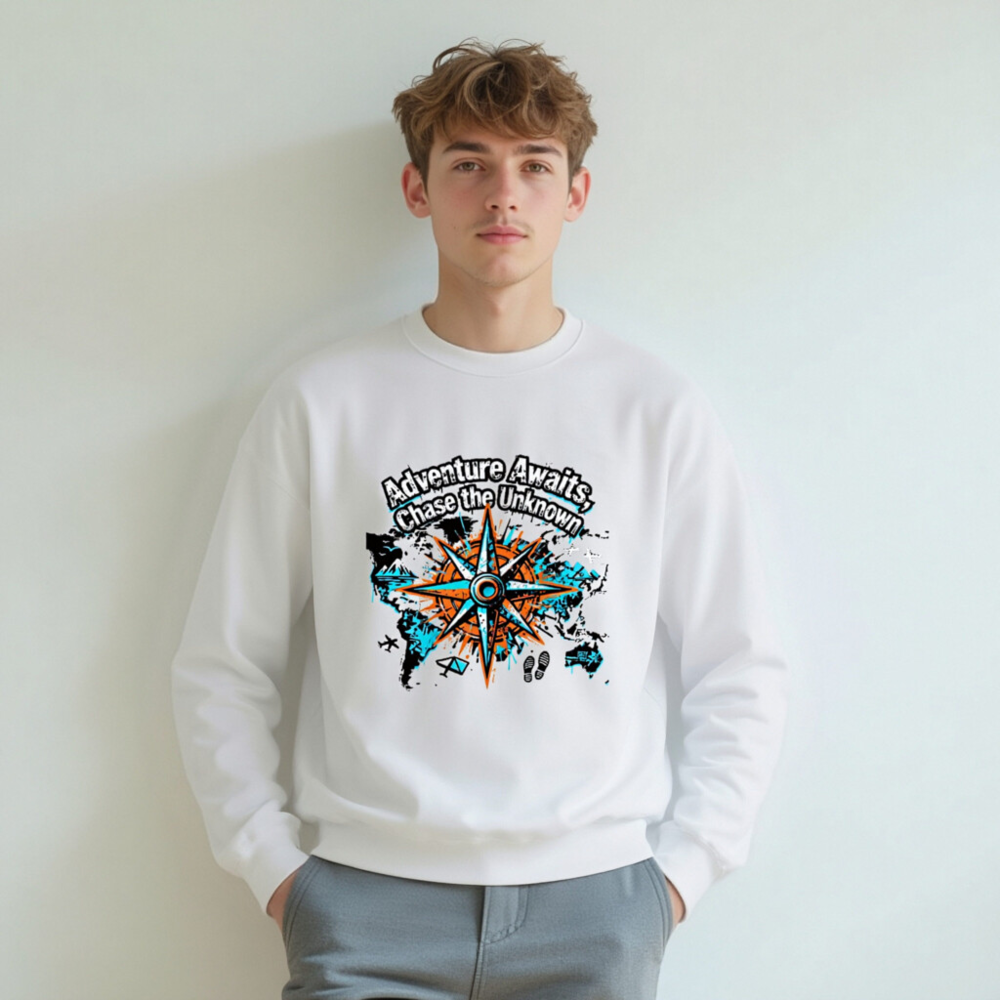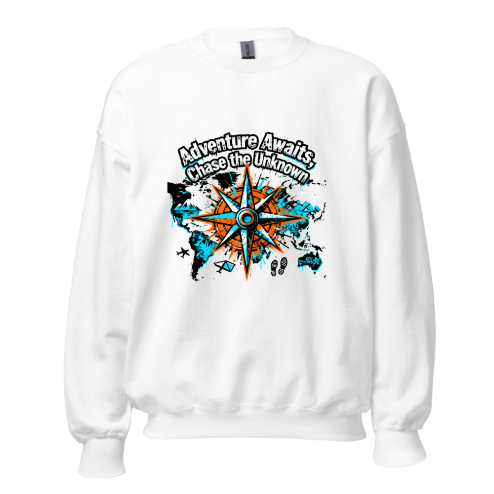 This unisex crew neck sweatshirt features a bold ‘Adventure Awaits, Chase the Unknown’ graphic with a vibrant compass over a world map splash. Designed for comfort and style, it’s perfect for travelers, explorers, and anyone seeking wanderlust-inspired fashion. Made from soft, durable fabric—ideal for daily wear or travel adventures. The eye-catching design pairs well with casual outfits and makes a statement wherever you go.