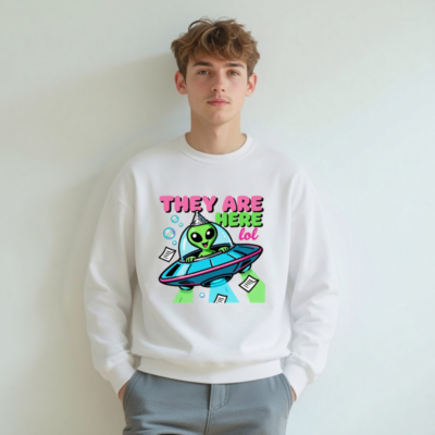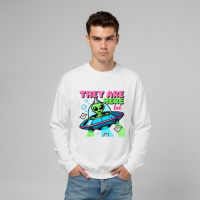 Unisex Crew Neck Sweatshirt – Alien UFO Party Design ‘They Are Here lol’