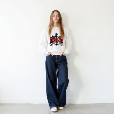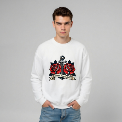 Classic unisex crew neck sweatshirt featuring a bold vintage tattoo-style design: navy anchor with rope, two vibrant red roses, and a ribbon banner reading ‘Anchored Hearts Forever’. Soft cotton blend, comfortable fit for everyday wear. Ideal for lovers of nautical romance and timeless symbolism. Perfect gift for anniversaries or maritime enthusiasts.