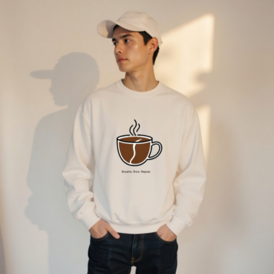 This unisex crew neck sweatshirt features a minimalist coffee cup graphic with steam and a coffee bean motif, paired with the motivational phrase ‘Breathe. Brew. Repeat.’—perfect for coffee lovers seeking comfort and style. Soft, relaxed fit; machine washable. Ideal for daily wear or as a thoughtful gift for baristas and caffeine enthusiasts.