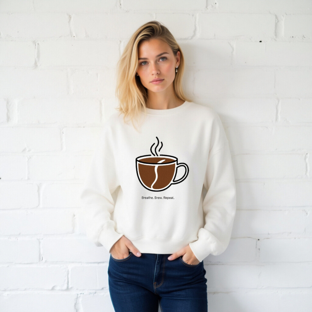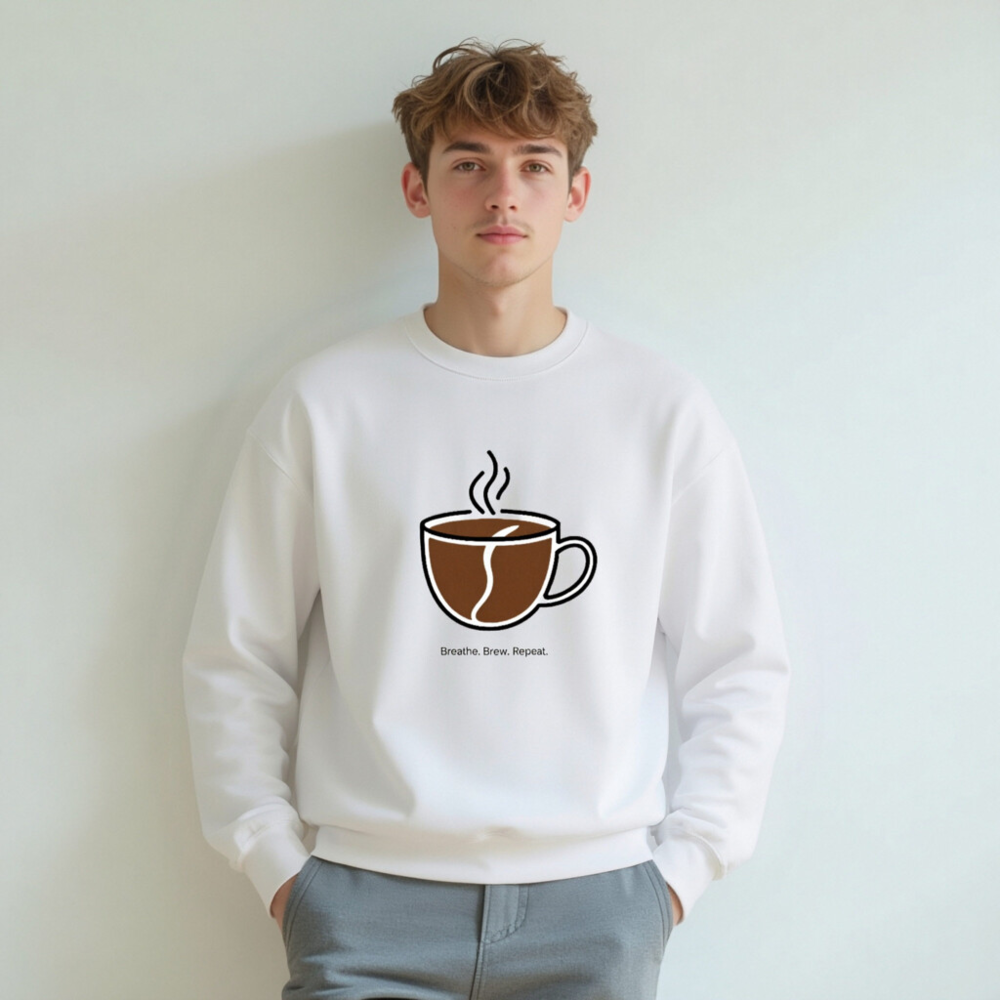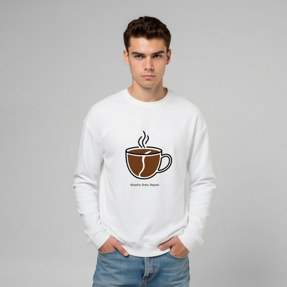 This unisex crew neck sweatshirt features a minimalist coffee cup graphic with steam and a coffee bean motif, paired with the motivational phrase ‘Breathe. Brew. Repeat.’—perfect for coffee lovers seeking comfort and style. Soft, relaxed fit; machine washable. Ideal for daily wear or as a thoughtful gift for baristas and caffeine enthusiasts.