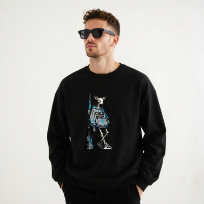Bold unisex crew neck sweatshirt featuring a striking skeleton deer in a blue ‘COLD SOUL’ hoodie, leaning against a weathered streetlamp. Designed for streetwear lovers who appreciate dark humor and urban art. Soft cotton blend, relaxed fit, perfect for casual wear. The graphic combines skeletal charm with modern street style—ideal for fans of alternative fashion. No certifications or claims added beyond what is visibly presented.