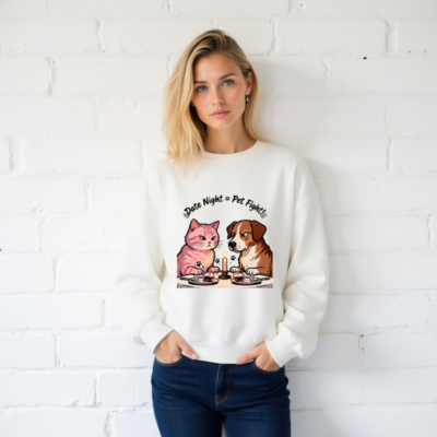 Unisex Crew Neck Sweatshirt – ‘Date Night = Pet Fight!’ Cat & Dog Graphic
