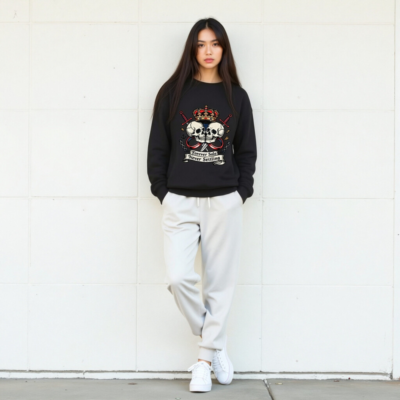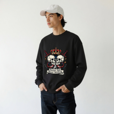 Bold unisex crew neck sweatshirt featuring a striking vintage-style graphic: two skulls facing each other under a regal crown, flanked by crossed swords and chains. The design includes the iconic phrase ‘Forever Solo Never Settling’ on a ribbon banner. High-quality soft cotton blend, comfortable fit for everyday wear. Ideal for fans of edgy, rebellious fashion with a touch of royal defiance.