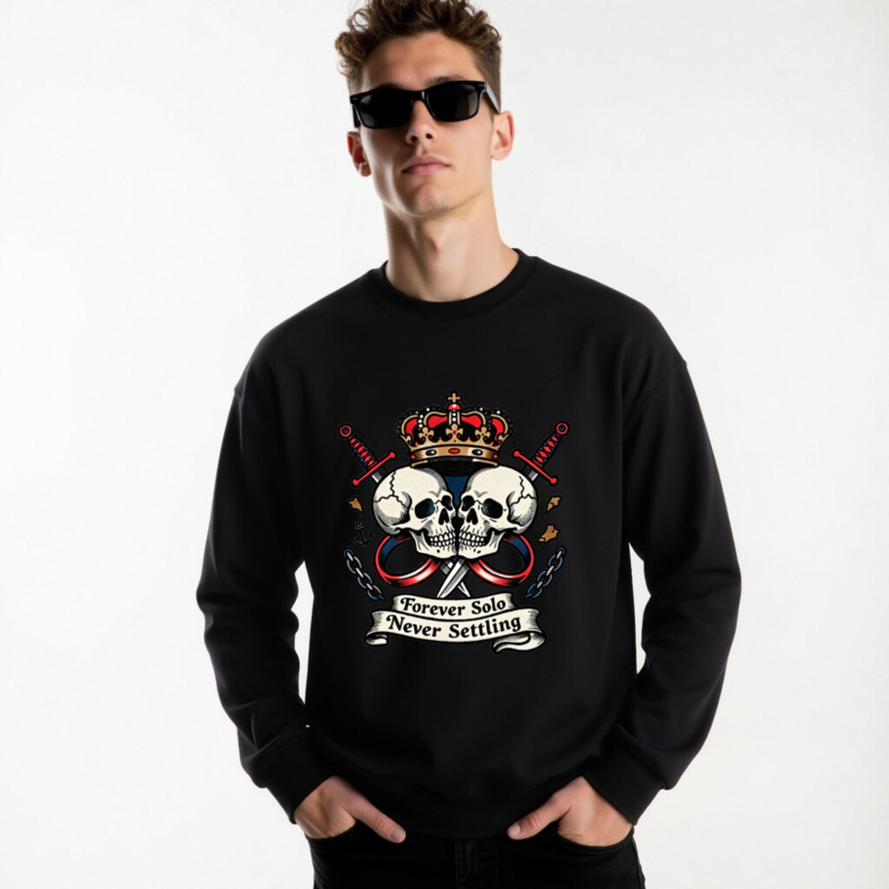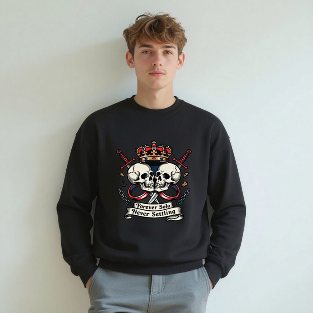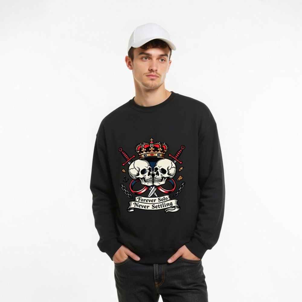 Bold unisex crew neck sweatshirt featuring a striking vintage-style graphic: two skulls facing each other under a regal crown, flanked by crossed swords and chains. The design includes the iconic phrase ‘Forever Solo Never Settling’ on a ribbon banner. High-quality soft cotton blend, comfortable fit for everyday wear. Ideal for fans of edgy, rebellious fashion with a touch of royal defiance.