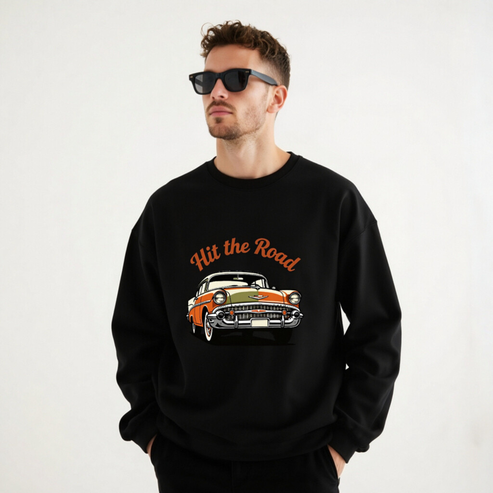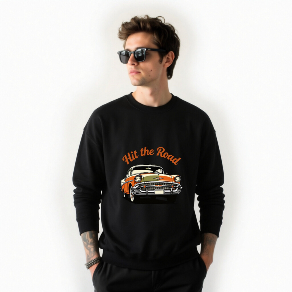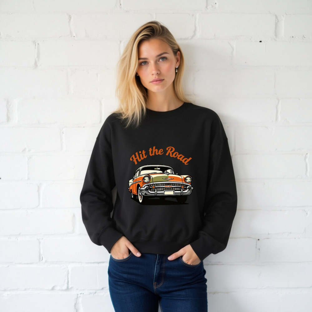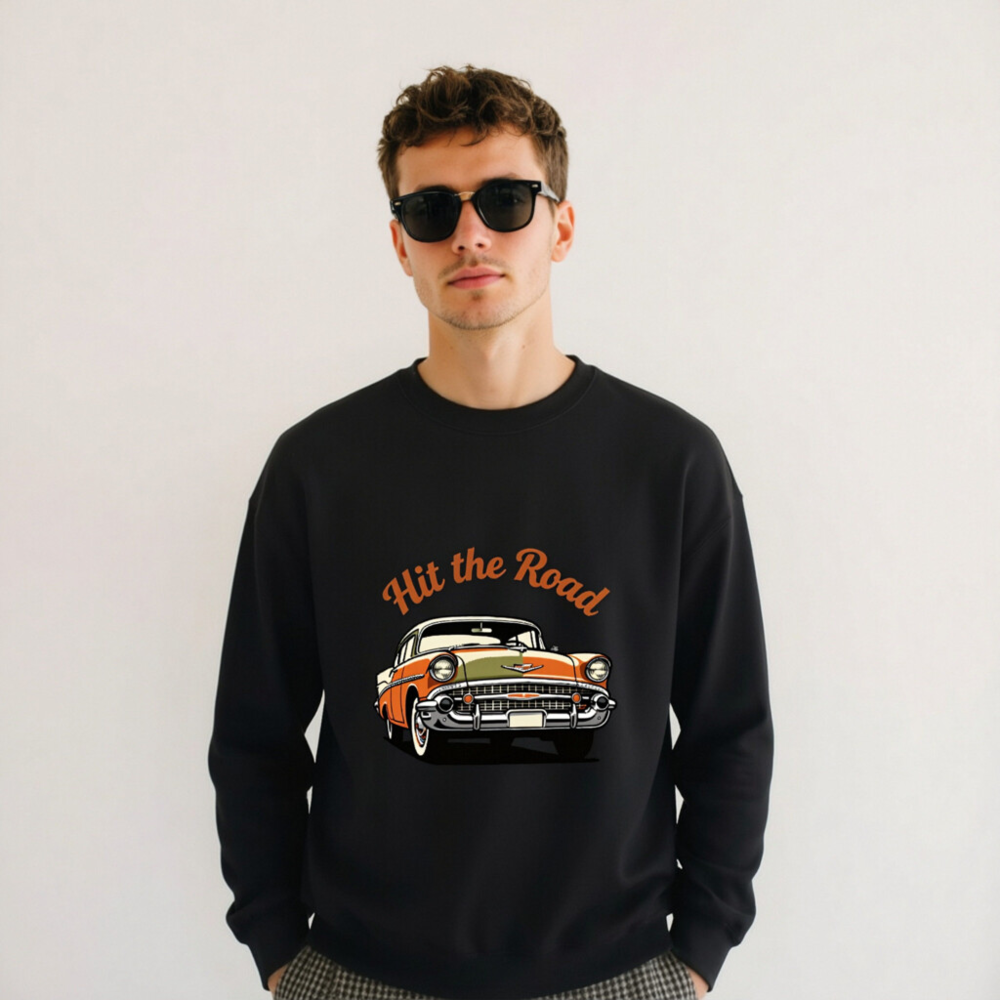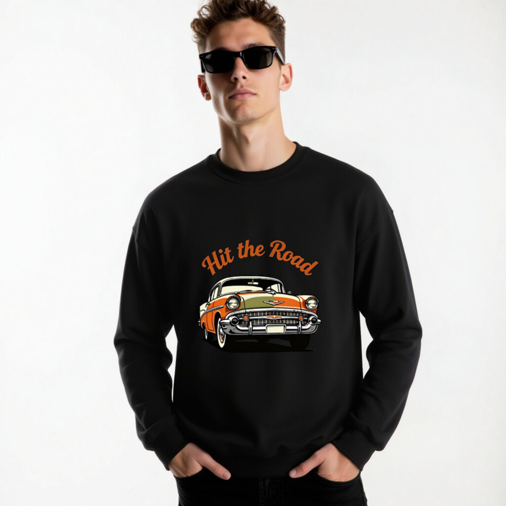 This unisex crew neck sweatshirt features a vibrant vintage car graphic with ‘Hit the Road’ text in retro orange script. Crafted for comfort and style, it’s perfect for car enthusiasts and road trip lovers. The black base highlights the bold design, making it a standout casual piece. Ideal for everyday wear or as a gift for classic car fans.