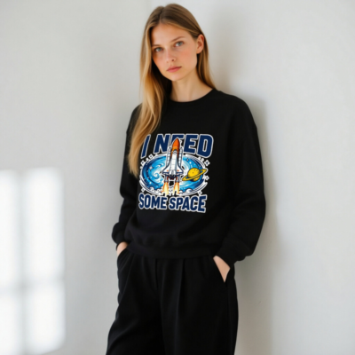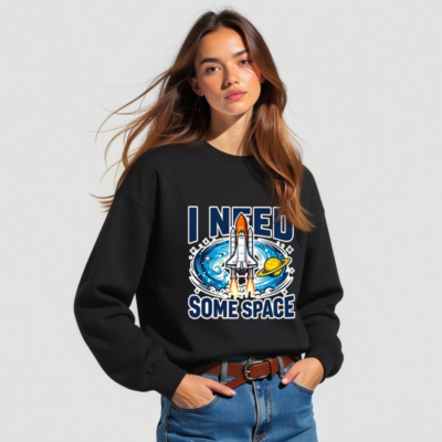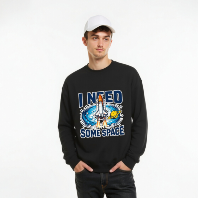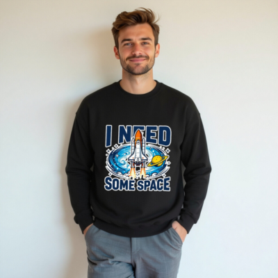 Show your cosmic spirit with this unisex crew neck sweatshirt featuring a vibrant ‘I NEED SOME SPACE’ design — a space shuttle blasting off beside Saturn, set against swirling blue nebula and stars. Soft black fabric, comfortable fit for all genders. Perfect for space lovers, astronauts, or anyone needing a little extra room in their day. Officially licensed graphic print.