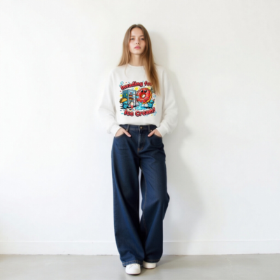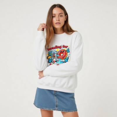 Fun unisex crew neck sweatshirt featuring a playful ‘Invading for Ice Cream!’ design with cute blue aliens, a smiling donut, taco, milkshake, and fridge. Soft, comfortable fit—ideal for casual wear. Perfect gift for food lovers and pop culture fans. Made with quality Gildan fabric (Gildan tag visible).