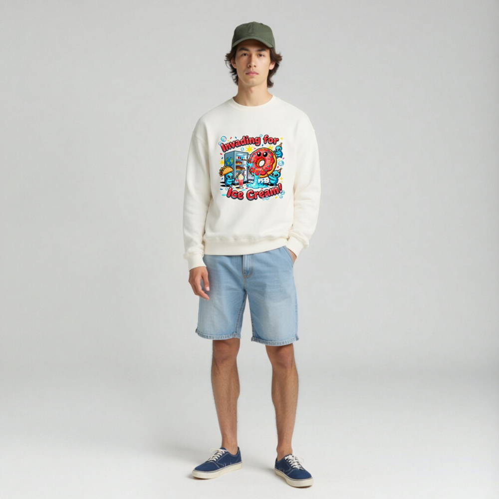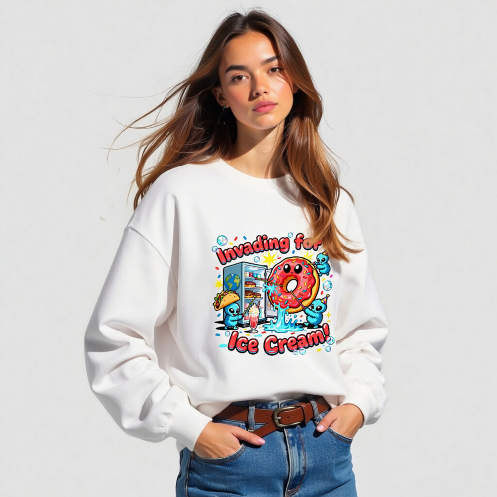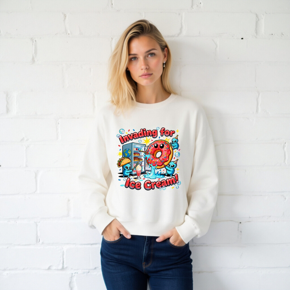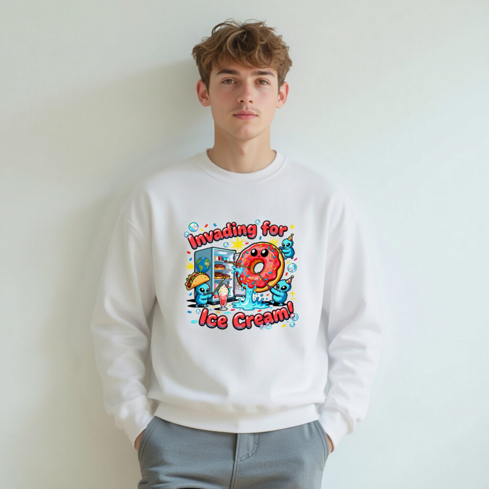 Fun unisex crew neck sweatshirt featuring a playful ‘Invading for Ice Cream!’ design with cute blue aliens, a smiling donut, taco, milkshake, and fridge. Soft, comfortable fit—ideal for casual wear. Perfect gift for food lovers and pop culture fans. Made with quality Gildan fabric (Gildan tag visible).