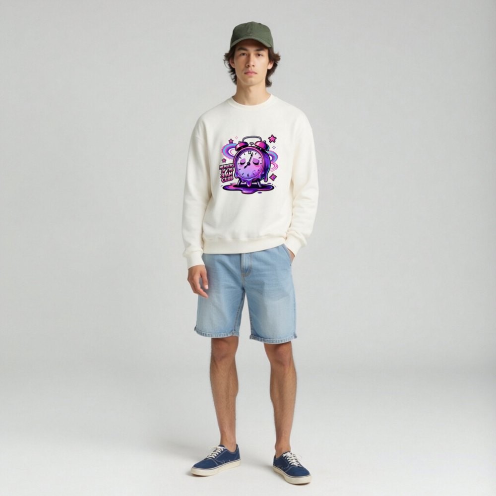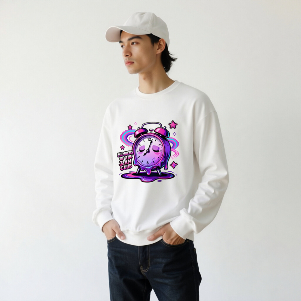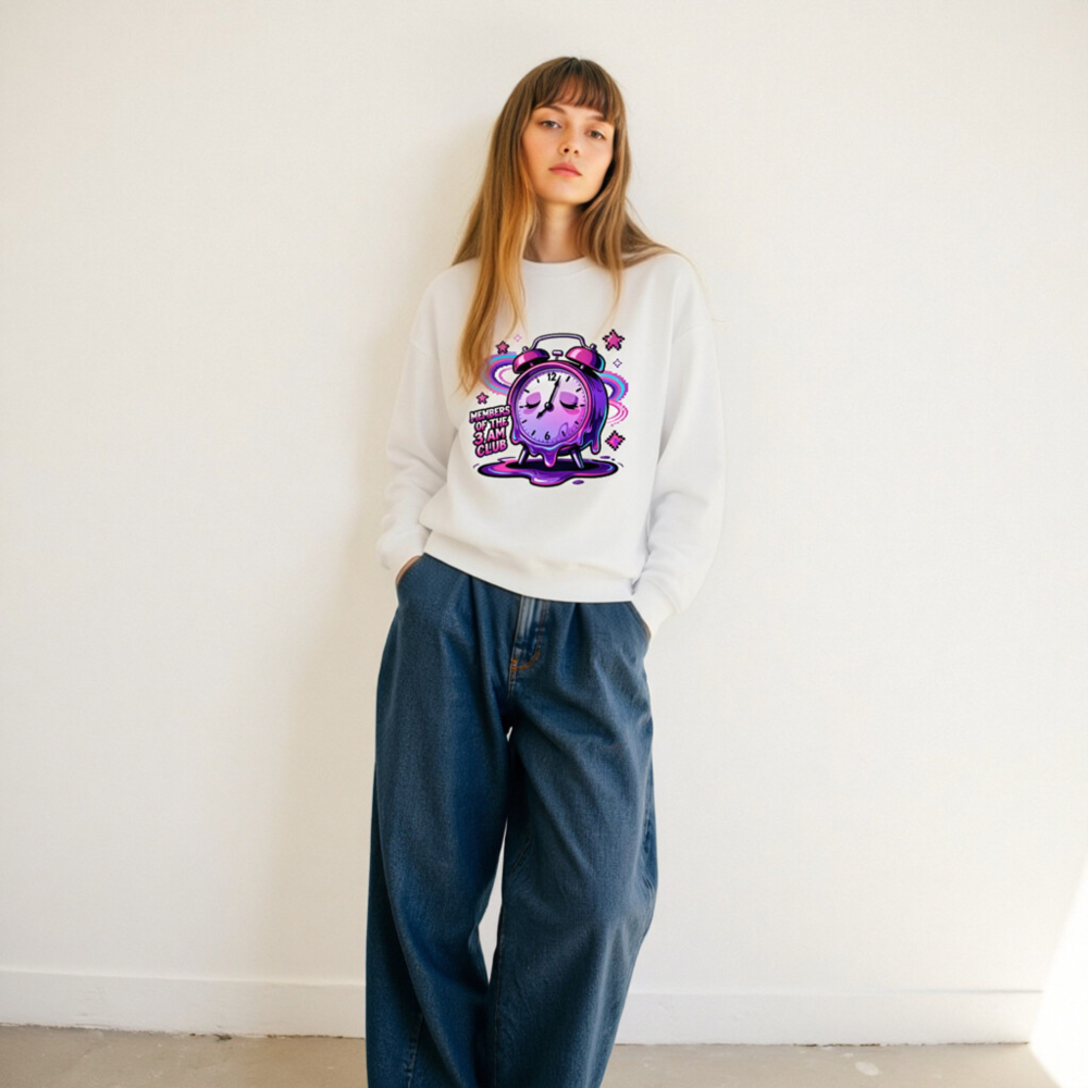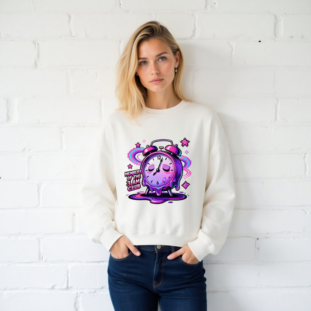 Wear the ‘Members of the 3 AM Club’ vibe with this unisex crew neck sweatshirt featuring a vibrant, melting alarm clock design in purple and pink glitch art style. Perfect for night owls and dreamers—soft, comfortable, and bold. Ideal for casual wear or as a statement piece for early risers who embrace the late-night energy. Designed for all genders, it pairs effortlessly with jeans or joggers. Let your sleep schedule speak.