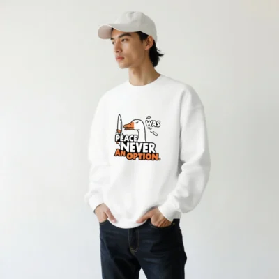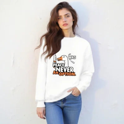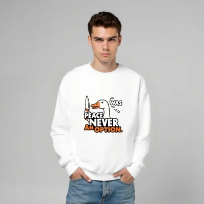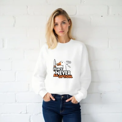 This unisex crew neck sweatshirt features a bold graphic of a duck holding a knife, paired with the iconic phrase ‘PEACE NEVER WAS AN OPTION.’ Designed for comfort and statement-making style, it’s ideal for those who appreciate dark humor and pop culture references. Soft cotton blend, classic fit, available in all sizes. Perfect for everyday wear or as a conversation starter.
