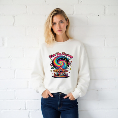 Wear the magic with this unisex crew neck sweatshirt featuring a vibrant ‘Ride The Fantasy’ design: a colorful carousel set against a swirling rainbow galaxy, stars, moons, and unicorns. Soft, comfortable, and universally fitting—ideal for dreamers and fantasy lovers. Perfect for casual wear, gifts, or expressing your whimsical side. Officially licensed Gildan® garment (tag visible).