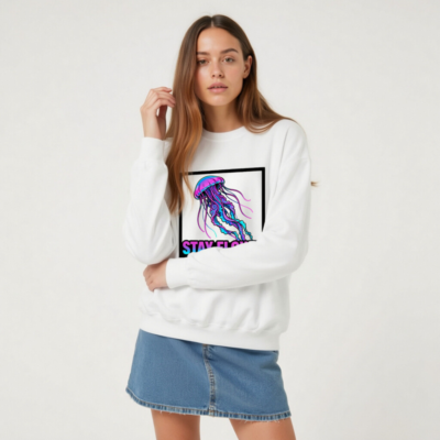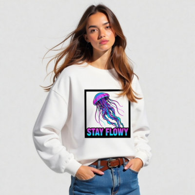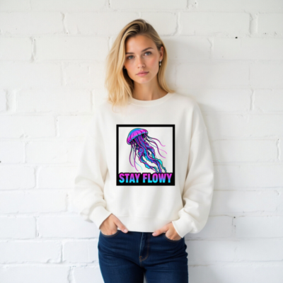 This unisex crew neck sweatshirt features a vibrant neon jellyfish design with gradient pink, purple, and blue hues inside a bold black frame. The ‘STAY FLOWY’ slogan adds playful motivation. Made from soft, durable fabric for everyday comfort. Designed for casual wear, gym sessions, or relaxed outings. True to size, machine-washable. Ideal for jellyfish lovers and those who embrace fluidity in life.