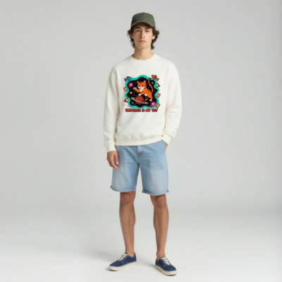 This unisex crew neck sweatshirt features a vibrant cosmic cat design—orange tabby playing with yarn, surrounded by planets, fish, bells, and crackers. The playful ‘Universe Is My Toy’ slogan adds whimsy. Soft, comfortable fit for everyday wear. Perfect for cat lovers and space enthusiasts. Made with quality fabric for durability and comfort.