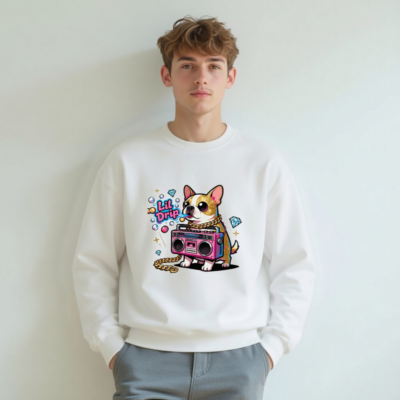 Show off your vibe in this unisex crew neck sweatshirt featuring a vibrant ‘Lil Drip’ dog with gold chain and pink boombox graphic. Soft, comfortable, and stylish—perfect for casual wear. The bold cartoon design stands out with sparkling diamonds and retro flair. One-size-fits-most, machine-washable, and ready to elevate your everyday look.