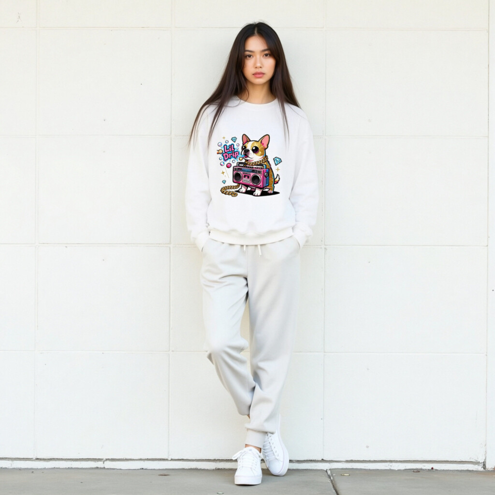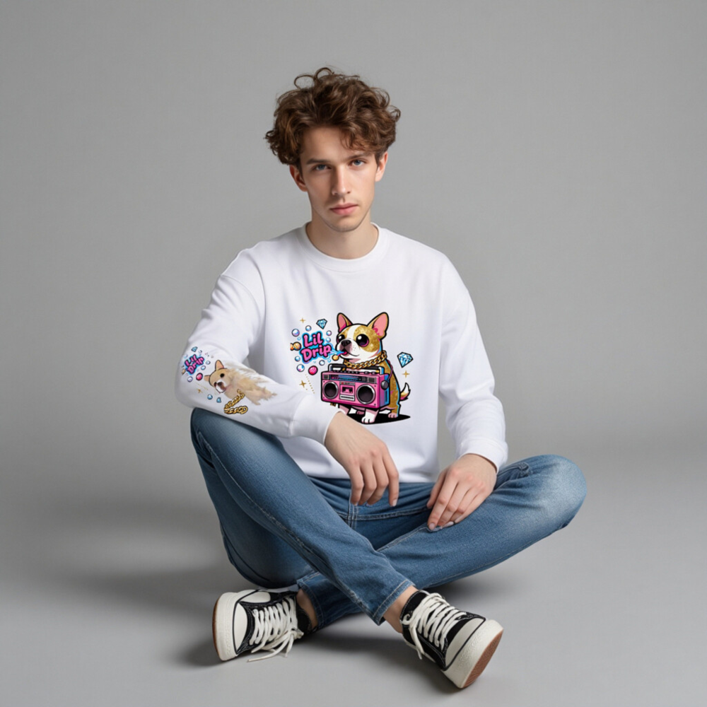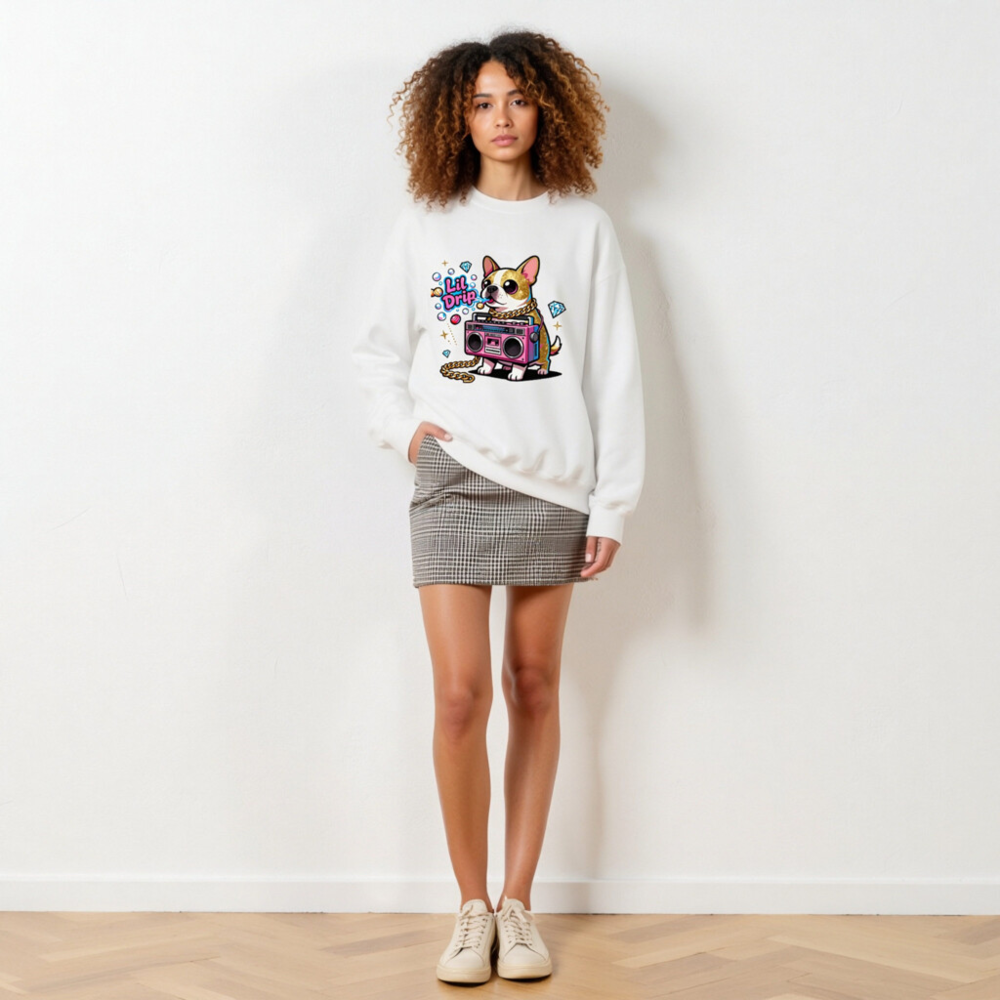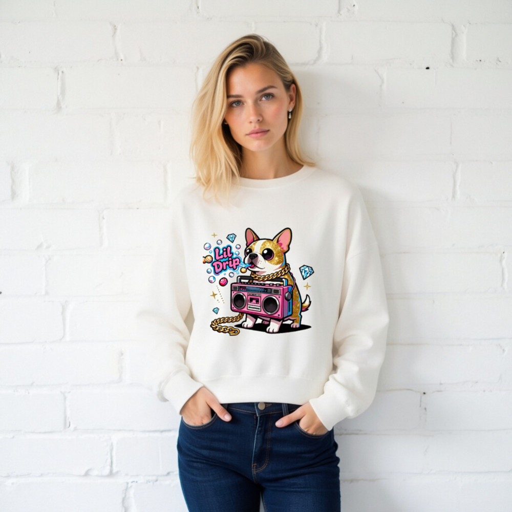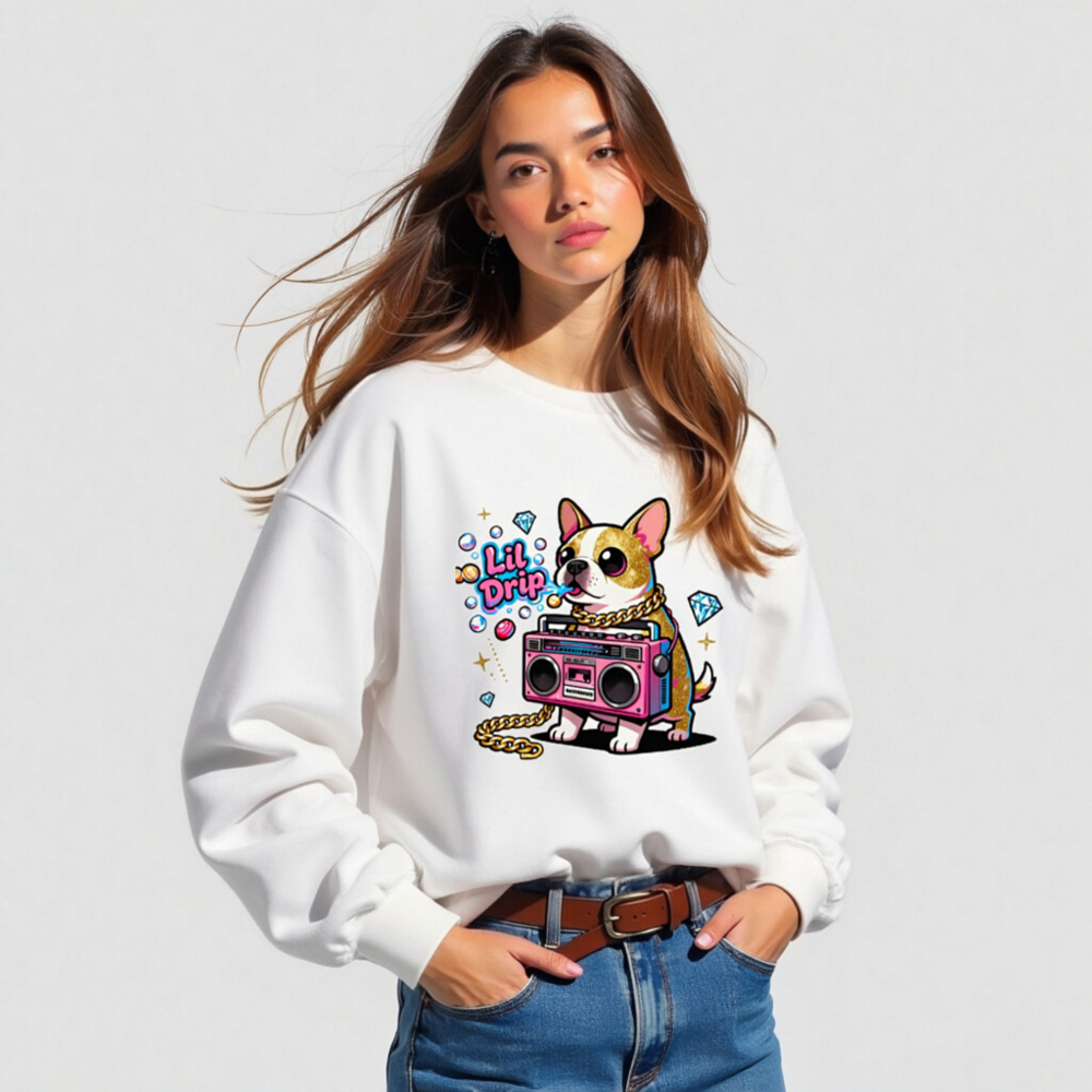 Show off your vibe in this unisex crew neck sweatshirt featuring a vibrant ‘Lil Drip’ dog with gold chain and pink boombox graphic. Soft, comfortable, and stylish—perfect for casual wear. The bold cartoon design stands out with sparkling diamonds and retro flair. One-size-fits-most, machine-washable, and ready to elevate your everyday look.