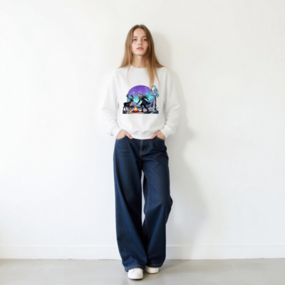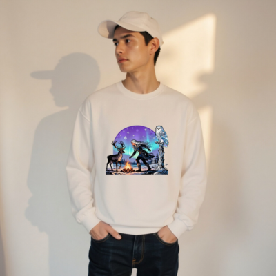 This unisex crew neck sweatshirt features a captivating winter fantasy print: a silver-haired figure by a campfire, a majestic reindeer, and a snowy owl perched on a tree stump under the aurora borealis. Crafted for comfort and style, it’s perfect for cold-weather lovers who appreciate mythical art. Ideal as a cozy everyday wear or a unique gift.