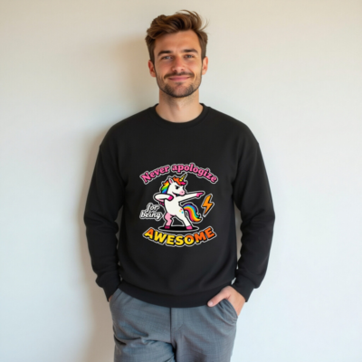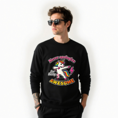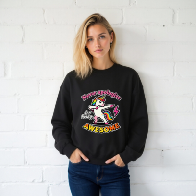 Show off your confidence with this unisex crew neck sweatshirt featuring a vibrant dabbing unicorn design and the bold message ‘Never apologize for being AWESOME’. Soft, comfortable fit ideal for everyday wear. Perfect gift for unicorn lovers and anyone who embraces their awesome self. Machine washable, durable print, and true to size.