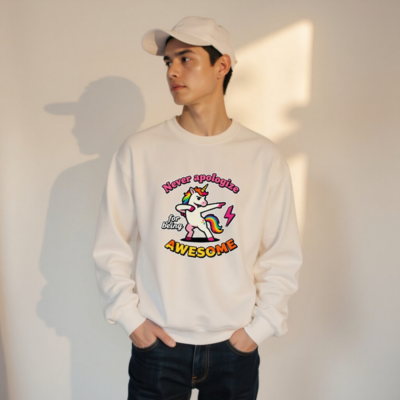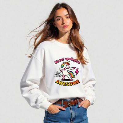 Show off your confidence with this unisex crew neck sweatshirt featuring a vibrant dabbing unicorn graphic and the bold message ‘Never apologize for being AWESOME’. Soft, comfortable cotton blend, perfect for casual wear. Designed to celebrate individuality—no apologies needed. Ideal for everyday style or gift-giving.