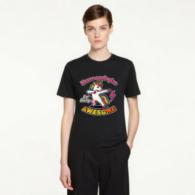 Show off your confidence with this unisex staple t-shirt featuring a vibrant dabbing unicorn with rainbow mane and tail, paired with the bold slogan ‘Never apologize for being AWESOME’. Made from comfortable cotton blend, perfect for everyday wear. Ideal gift for unicorn lovers and anyone who embraces their awesome self. Classic fit, premium print, durable design.