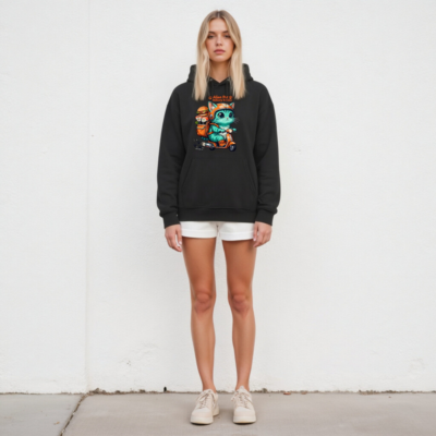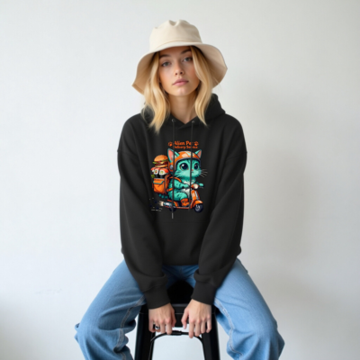 This unisex essential eco hoodie features a playful, high-resolution print of a teal alien cat in an orange helmet riding a scooter, delivering burgers and sushi under the ‘Alien Pet Delivery Service’ logo. Made with sustainable materials for comfort and style. Perfect for pet lovers and sci-fi fans seeking unique, everyday wear.