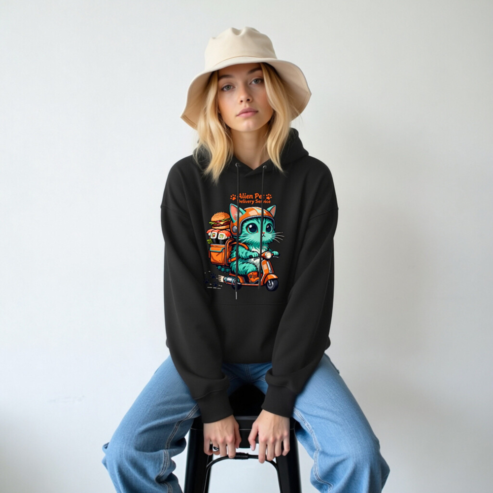 Unisex Eco Hoodie – Alien Pet Delivery Service Cat on Scooter
