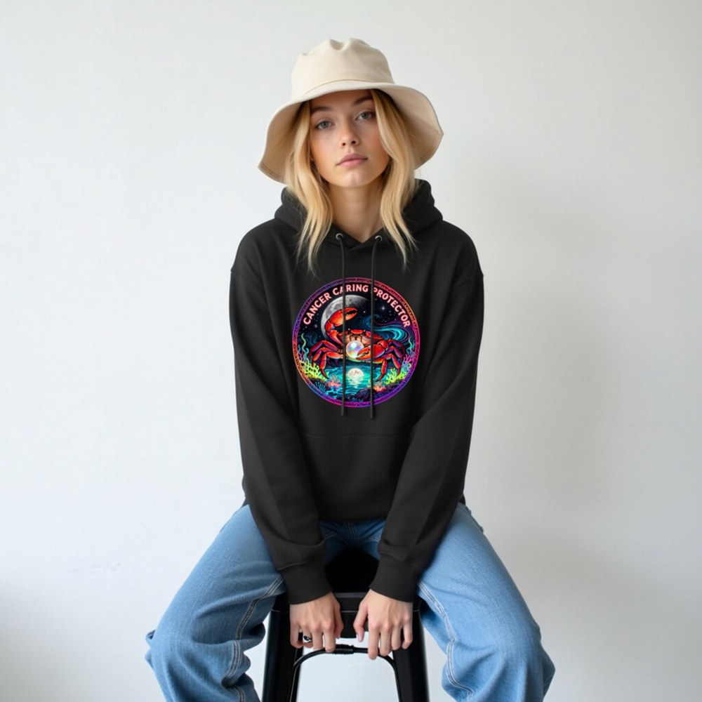 Wear the Cancer zodiac symbol with pride: a vibrant, cosmic crab holding a crystal orb under moonlight, surrounded by colorful sea life. This unisex essential eco hoodie features sustainable materials and ethical production—designed for comfort, style, and meaning. Perfect for astrology lovers seeking meaningful, earth-conscious apparel.