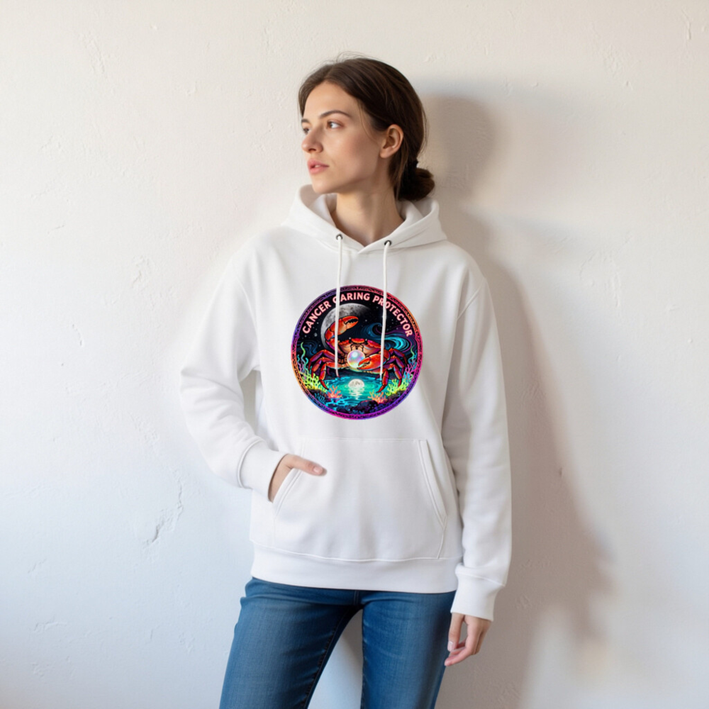 Wear your compassion: This unisex essential eco hoodie features a vibrant, symbolic crab holding a crystal orb under moonlight—embodying the Cancer zodiac’s nurturing spirit. Made with sustainable materials, it’s designed for comfort and purpose. The bold ‘Cancer Caring Protector’ text circles the artwork, blending astrology, art, and advocacy. Perfect for cancer supporters, caregivers, or anyone who values emotional resilience and ethical fashion.
