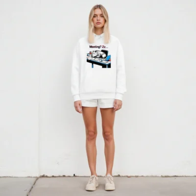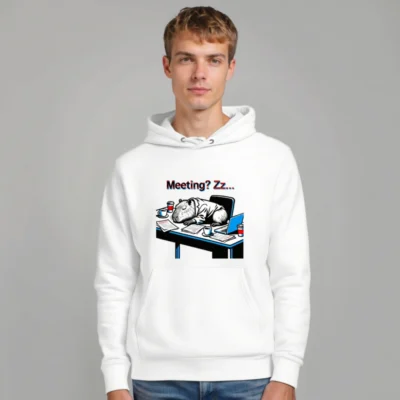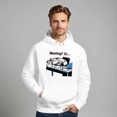 This unisex essential eco hoodie features a humorous capybara sleeping at a cluttered office desk with coffee cups and a laptop—perfect for remote workers who’ve been there. Made from sustainable cotton blend, it’s soft, comfortable, and designed for everyday wear. The bold ‘Meeting? Zz…’ text adds wit to your wardrobe. Ideal for casual or work-from-home days.