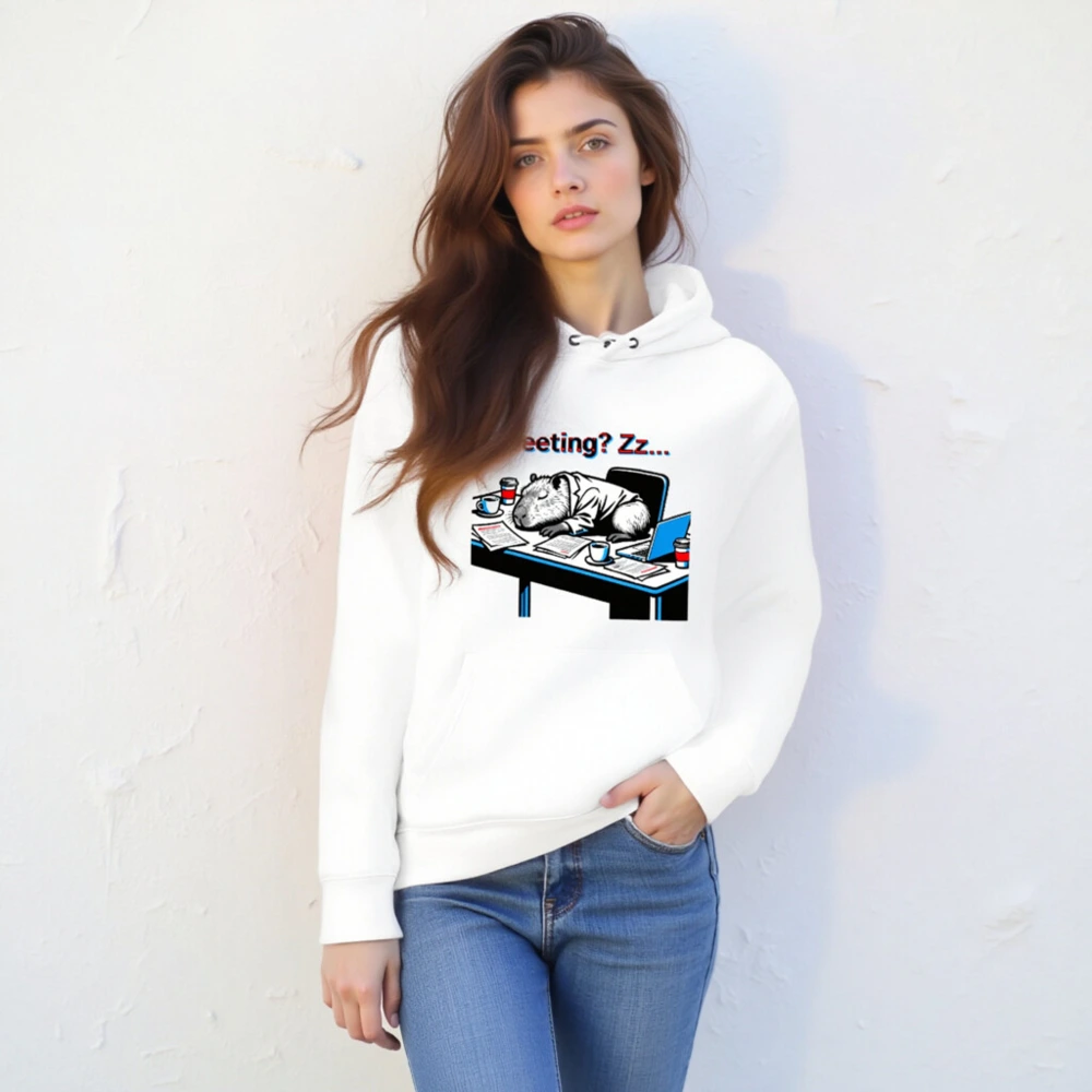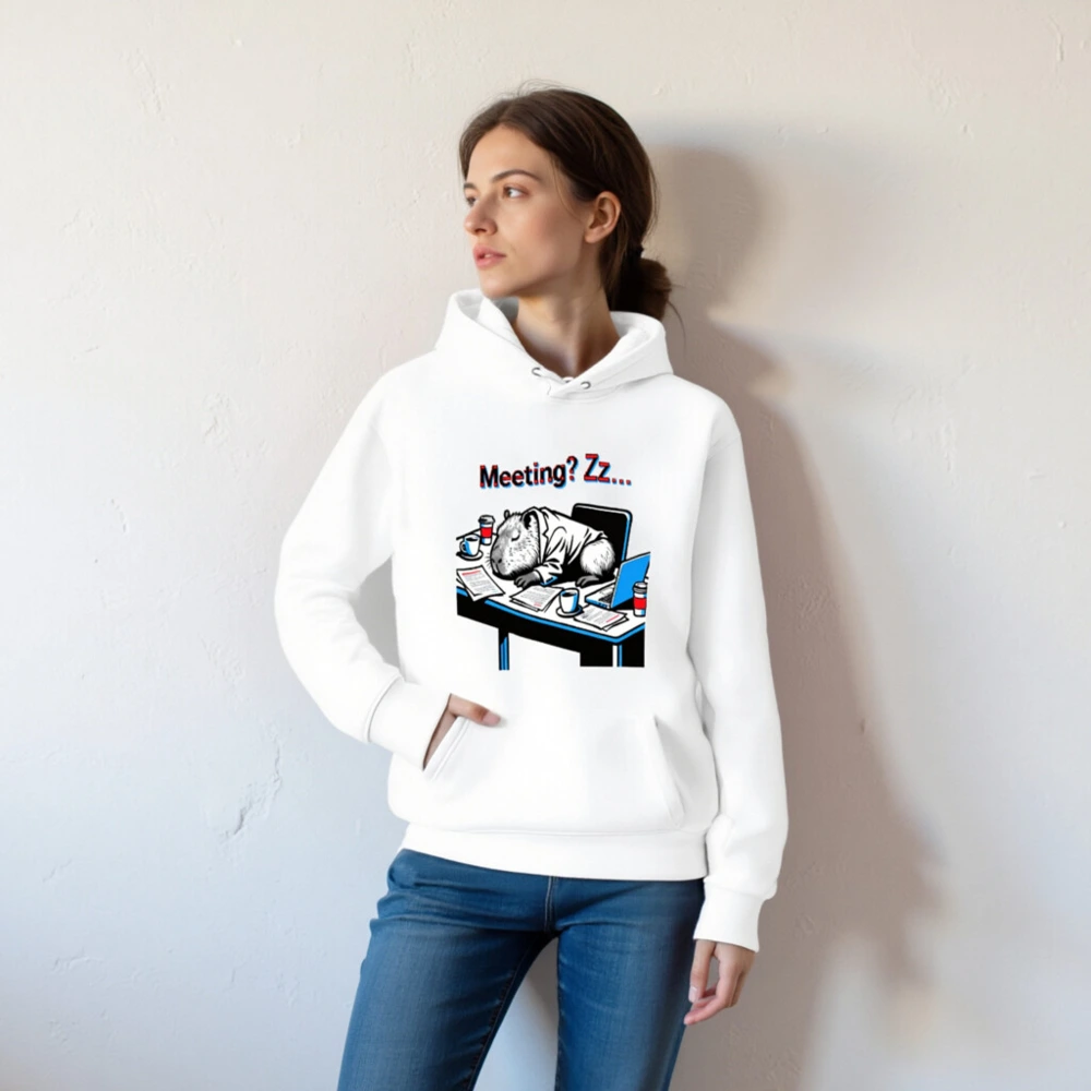 This unisex essential eco hoodie features a humorous capybara sleeping at a cluttered office desk with coffee cups and a laptop—perfect for remote workers who’ve been there. Made from sustainable cotton blend, it’s soft, comfortable, and designed for everyday wear. The bold ‘Meeting? Zz…’ text adds wit to your wardrobe. Ideal for casual or work-from-home days.