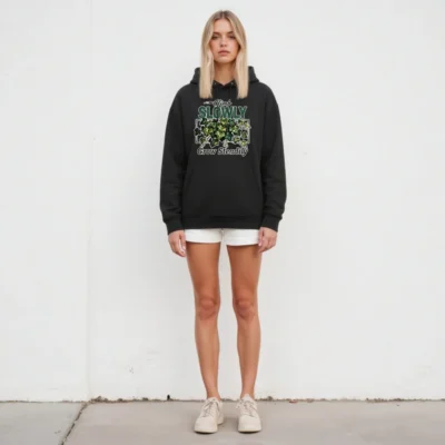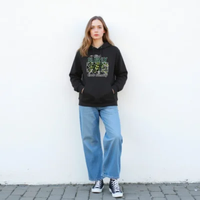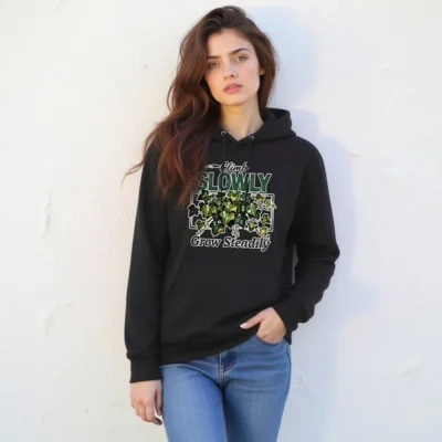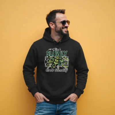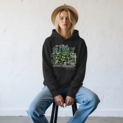This unisex essential eco hoodie features a nature-inspired design with ivy vines and the motivational phrase ‘Climb Slowly, Grow Steadily’—perfect for mindful living. Made from a soft, sustainable cotton blend, it’s designed for comfort and everyday wear. The relaxed fit and front pouch pocket add practicality, while the earthy green tones and botanical motif reflect our commitment to eco-conscious style. Ideal for those who value sustainability without compromising on comfort or design.