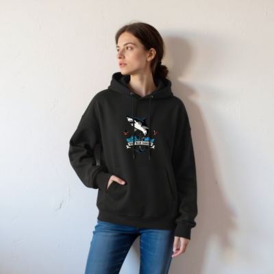 This unisex essential eco hoodie features a bold ‘Deep Blue Danger’ shark graphic with anchor and wave motifs—perfect for ocean lovers. Made from sustainable cotton blend, it’s designed for comfort and conscious style. The versatile black hoodie pairs well with casual outfits and supports eco-friendly fashion choices. Ideal for everyday wear, gifts, or marine-themed collections. Shop responsibly—crafted for durability and planet care.