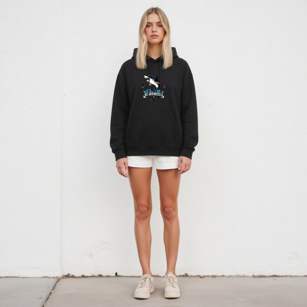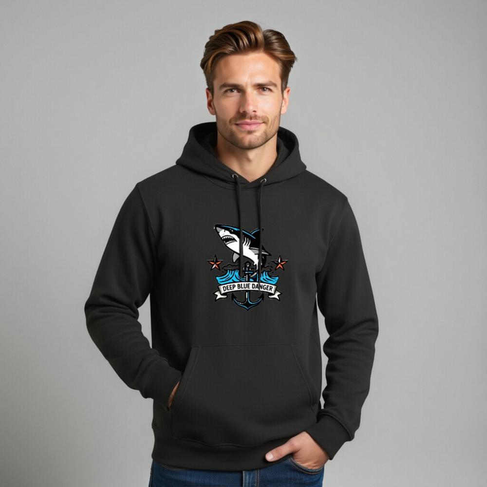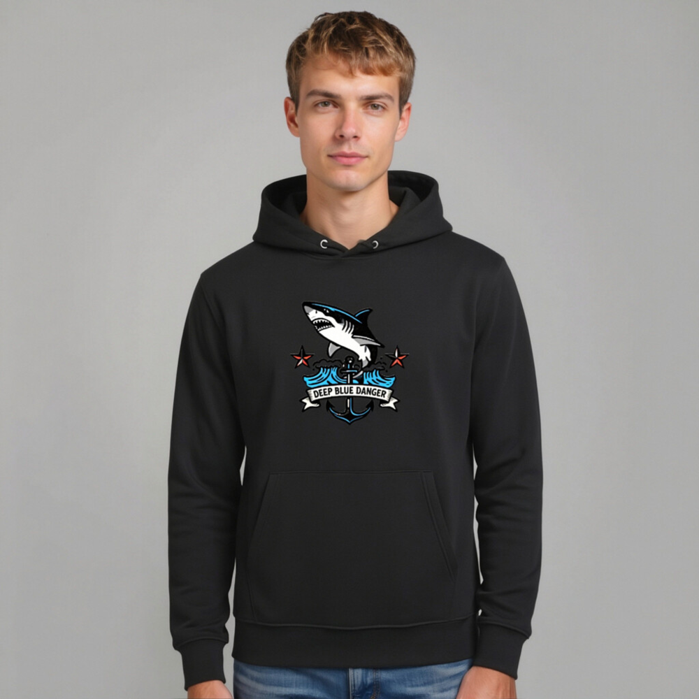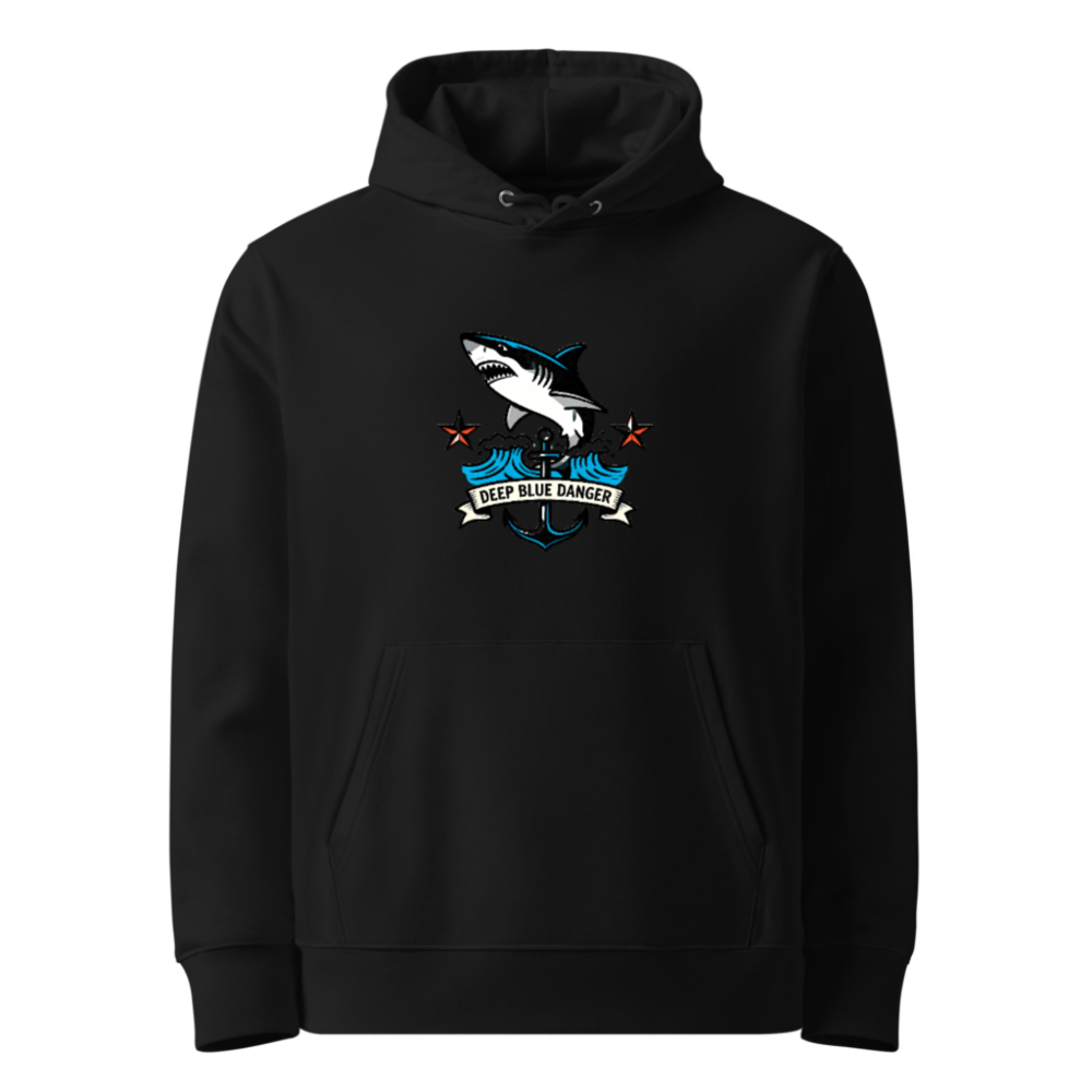 This unisex essential eco hoodie features a bold ‘Deep Blue Danger’ shark graphic with anchor and wave motifs—perfect for ocean lovers. Made from sustainable cotton blend, it’s designed for comfort and conscious style. The versatile black hoodie pairs well with casual outfits and supports eco-friendly fashion choices. Ideal for everyday wear, gifts, or marine-themed collections. Shop responsibly—crafted for durability and planet care.