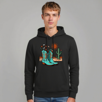Showcasing a vibrant desert scene with turquoise cowboy boots overflowing with wildflowers, a green saguaro cactus, and a warm sun—this unisex essential hoodie features a soft, eco-friendly cotton blend. Designed for comfort and style, it’s perfect for casual wear with a rustic western vibe. Machine washable, ethically made, and built to last—your everyday go-to hoodie.