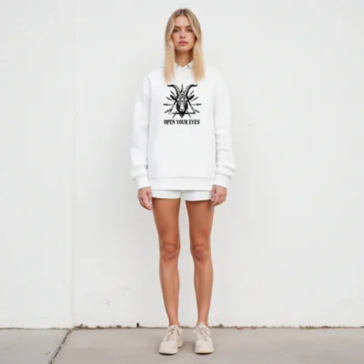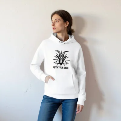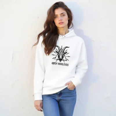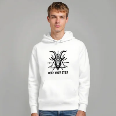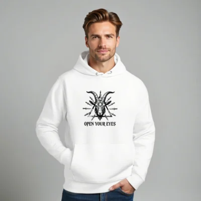 Wear the bold ‘Open Your Eyes’ unisex essential eco hoodie — featuring a striking black-and-white goat head with third eye and crossed knives inside a triangle. Made from sustainable materials, this premium hoodie combines edgy symbolism with everyday comfort. Ideal for those who embrace mystic aesthetics and conscious fashion. Unisex fit, soft fabric, front pouch pocket. Designed for self-expression and ethical style.