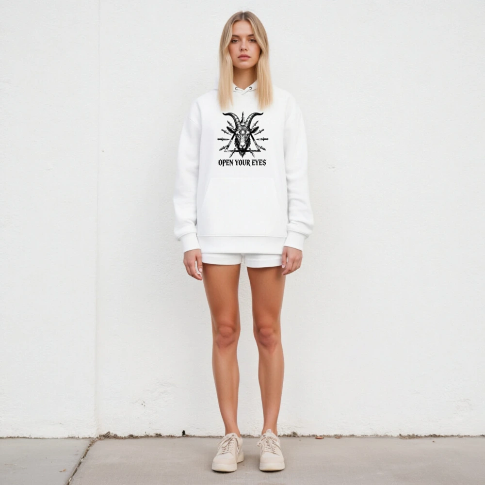 Wear the bold ‘Open Your Eyes’ unisex essential eco hoodie — featuring a striking black-and-white goat head with third eye and crossed knives inside a triangle. Made from sustainable materials, this premium hoodie combines edgy symbolism with everyday comfort. Ideal for those who embrace mystic aesthetics and conscious fashion. Unisex fit, soft fabric, front pouch pocket. Designed for self-expression and ethical style.