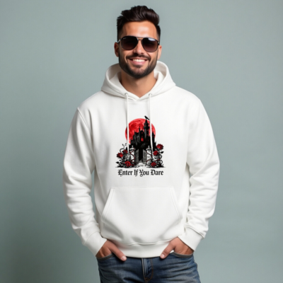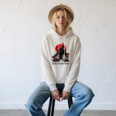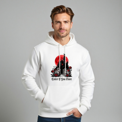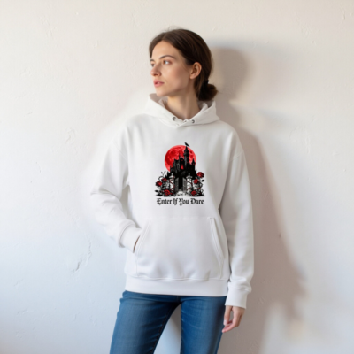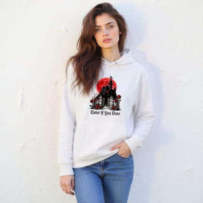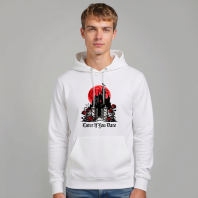 Wear this unisex essential eco hoodie featuring a striking gothic castle silhouette against a blood-red moon, adorned with thorny roses and a crow. The bold ‘Enter If You Dare’ slogan adds dark charm. Crafted for comfort and sustainability—made from eco-friendly materials. Perfect for fans of horror, fantasy, and alternative fashion. Ideal as a statement piece or gift.