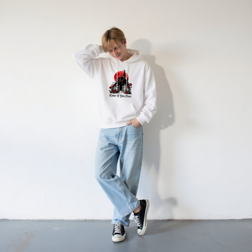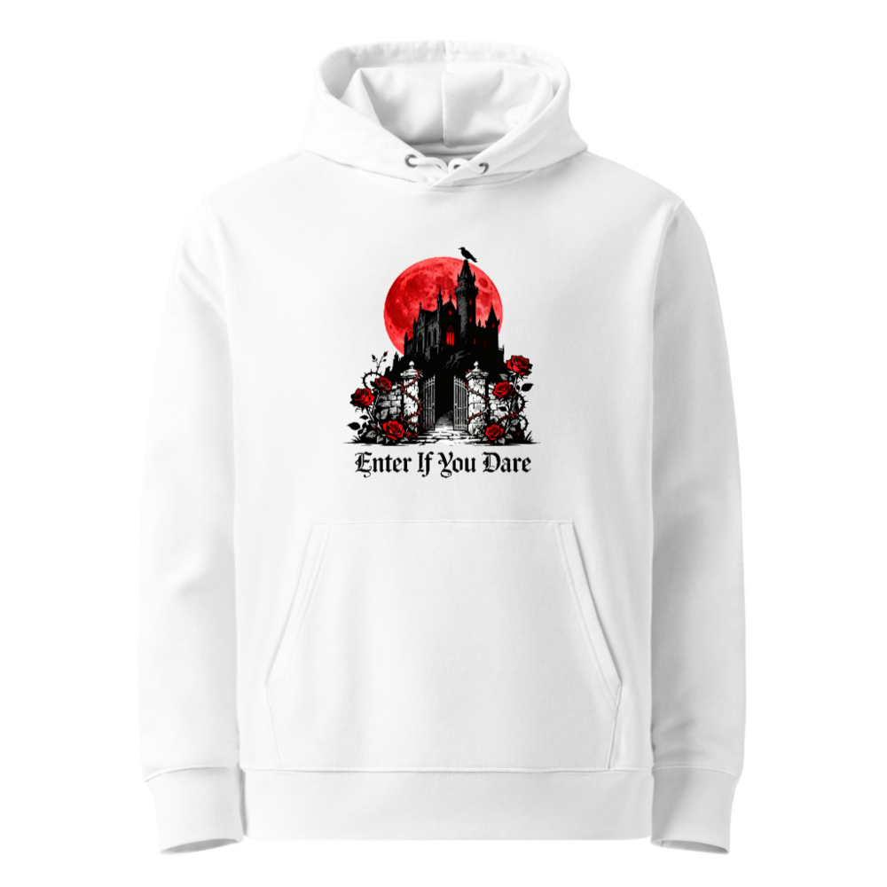 Wear this unisex essential eco hoodie featuring a striking gothic castle silhouette against a blood-red moon, adorned with thorny roses and a crow. The bold ‘Enter If You Dare’ slogan adds dark charm. Crafted for comfort and sustainability—made from eco-friendly materials. Perfect for fans of horror, fantasy, and alternative fashion. Ideal as a statement piece or gift.