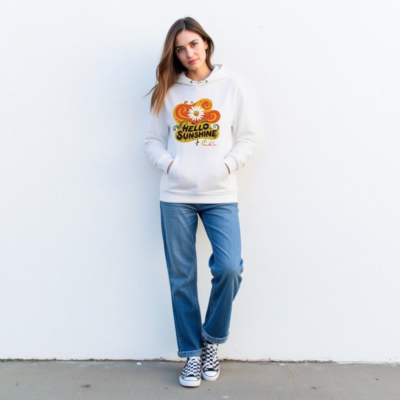 This unisex essential eco hoodie features a cheerful ‘Hello Sunshine’ daisy design with vibrant swirls, crafted from soft, sustainable organic cotton. Perfect for everyday comfort and conscious style—lightweight, cozy, and ethically made. Ideal for all ages and genders. Choose eco-friendly fashion without compromising on warmth or charm.