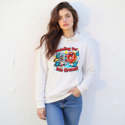 Show off your love for fun and sustainability with this unisex eco hoodie featuring a playful ‘Invading for Ice Cream!’ design—featuring a smiling donut, blue aliens, and tasty treats. Made from eco-friendly materials, it’s soft, comfortable, and perfect for casual wear. The bold graphic and vibrant colors make it a standout piece. Ideal for fans of quirky, pop-culture-inspired fashion.