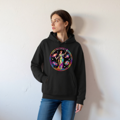 Wear the cosmic balance of Libra with this unisex essential eco hoodie. Featuring a vibrant, rainbow-hued Lady Justice holding scales and a feather against a starry galaxy backdrop, symbolizing harmony and justice. Made for comfort and sustainability—soft, durable, and ethically crafted. Perfect for astrology lovers, zodiac enthusiasts, or anyone seeking mindful style. Ideal for everyday wear or as a meaningful gift.